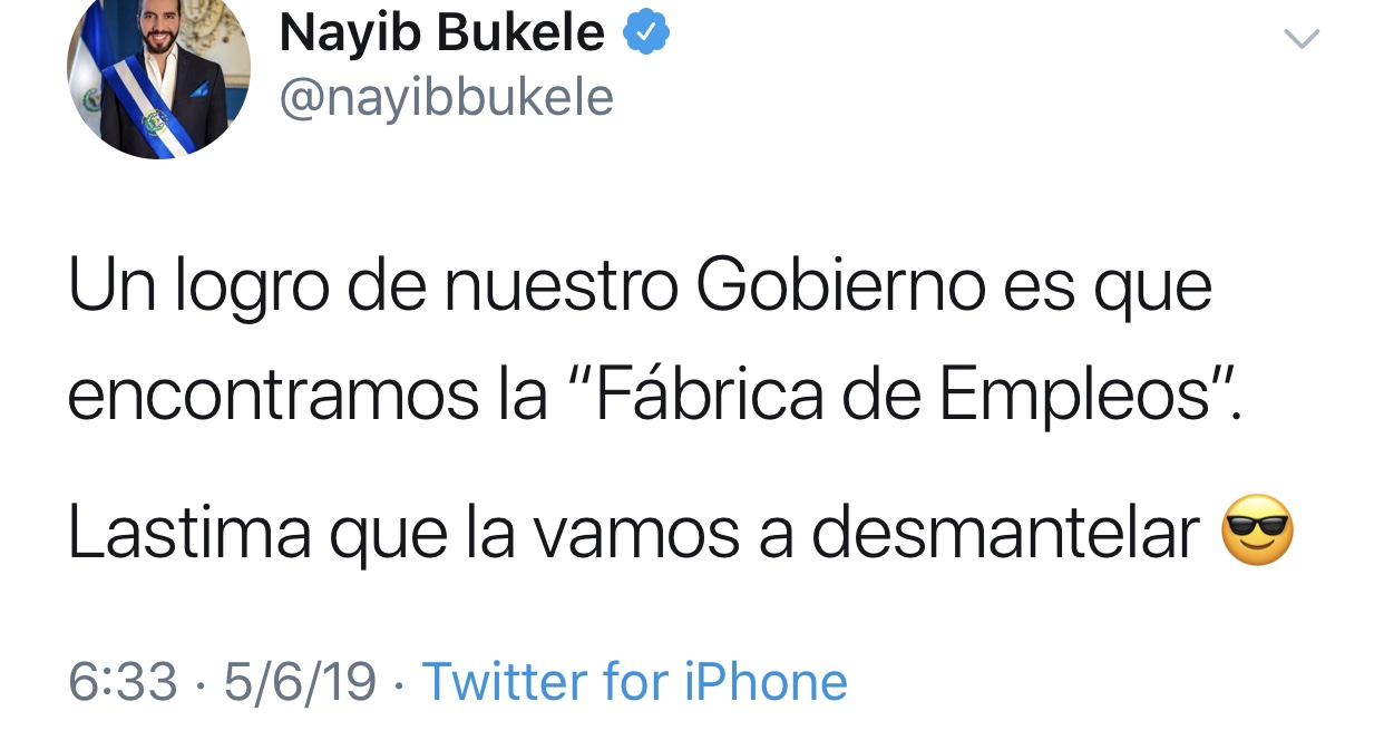 "Un logro de nuestro Gobierno es que encontramos la “Fábrica de Empleos”. Lastima que la vamos a desmantelar 8|".