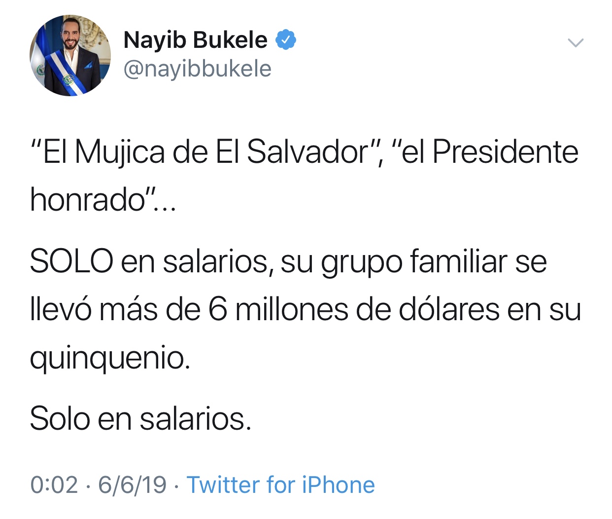 "“El Mujica de El Salvador”, “el Presidente honrado”... SOLO en salarios, su grupo familiar se llevó más de 6 millones de dólares en su quinquenio. Solo en salarios".