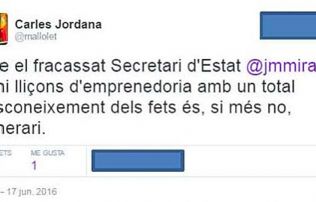 Al candidat per l’accèssit a millor busca-raons de DA, ja no li van quedar caràcters disponibles per elaborar un argument convincent, després de gastar gran part dels 140 caràcters disponibles en qualificar (desqualificar) la seva “víctima” com a fracassat, temerari i ignorant. Hauria pogut fer un segon, o un tercer twitt, però es veu que la consigna del partit que l’ha acollit és la d’argumentar poc, per no dir gens: es tracta directament d’insultar a l’adversari, ningunejar-lo com diuen al país del sud.