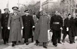 (Passejada del general Franco pels carrers de Barcelona després de la desfilada del 26 de gener, acompanyat pels seus ajudants i les autoritats locals i provincials. Miguel Mateu i Pla és a la dreta del dictador, amb bastó. La imatge va ser presa el 26 de Autor/a: CARLOS PÉREZ DE ROZAS/AFB)