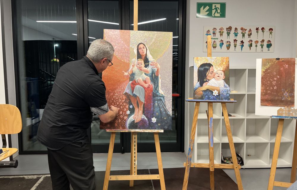 L’obra titulada ‘Divinitat, mare i fill’, està feta amb acrílic i utilitzant una tècnica que fa servir l’artista on aplica làtex per fer dibuixos i elements gràfics espontanis entre les capes i una vegada està tot llest, retira el làtex. Ramires assegura que per ell és “molt emocionant pintar una cosa així” i també que s’hagi organitzat aquesta subhasta: “Va ser una oportunitat única perquè és una interpretació amb el meu estil i tècnica d’un tall de fusta de la verge de fa mil anys”, afegeix.