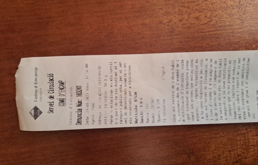 La multa li han imposat els agents de Circulació a Jordi Cascales Cusiné. I és ell qui fa la denúncia d’allò succeït. “En el supermercat L-Eclerc de la sortida d’Encamp en sentit nord he parat a comprar el pa, he ‘aparcat’ el vehicle davant de la porta i en el temps que no ha arribat a cinc minuts que era dins de l’establiment, m’han sancionat amb 120 euros per deixar el cotxe allí…”, explica Cascales. “Sempre que passo per davant, hi ha mínim dos o tres cotxes allí estacionats, jo mil cops he parat a comprar el pa, mai he vist sancionar algú…”, deixa clar aquest resident encampadà.