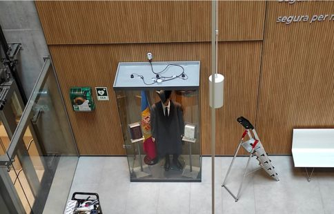 La cosa és que durant tota la setmana passada, o almenys una bona part, operaris externs i treballadors de la d’administració judicial, van estar fent mans i mànigues al vestíbul de la Seu de la Justícia, al costat d’un dels ascensors i més al costat encara d’un dispositiu desfibril·lador, per instal·lar una vitrina d’una mida notable. Després d’haver encaixat l’urna de vidre, al seu interior hi apareixia el maniquí abillat amb capa i barret.