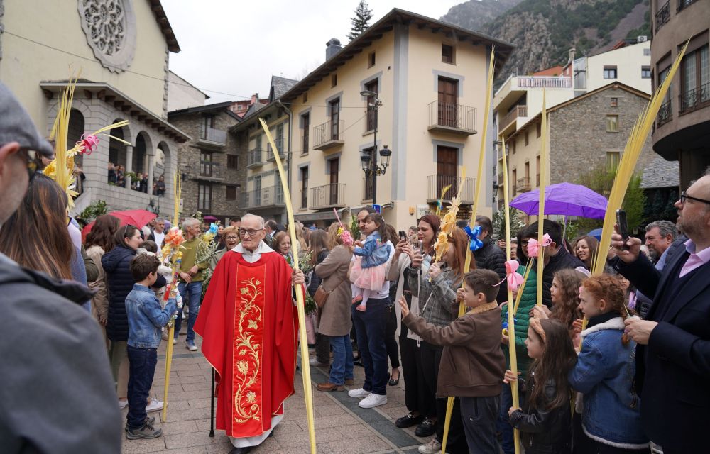 Els veïns de la parròquia, especialment els més petits, han aixecat ben amunt les seves palmes, palmons i branques de llorer i olivera que els han comprat els padrins mentre Sàrries ha iniciat la seva oració habitual. L’arxipreste de les Valls d’Andorra ha bromejat amb les quatre gotes que han començat a caure, recordant que és aigua beneïda, abans de fer, juntament amb mossèn Anto, la lectura de l’evangeli que recordava l’entrada de Jesús a la capital hebrea. Ha estat un text molt breu, probablement degut al temps, i quan els sacerdots han finalitzat, Sàrries s’ha fet un bany de masses entre els assistents, beneint-los la palma i el que fos necessari mentre els fidels s’anaven acostant per donar la benvinguda al moment més important de l’any litúrgic cristià.