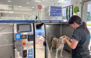 La Laura és la perruquera canina de Lavakan, un servei de tall i neteja que pertany a la botiga Més Que Animals. Lavakan va obrir durant els primers temps de la pandèmia, fa cosa de quatre anys. El local està dividit en dues parts ben diferenciades: neteja i tall. La neteja es realitza amb una rentadora especial per a petites mascotes –en tenen tres– i hi ha dues possibilitats d’ús: neteja automàtica completa o combinació de neteja automàtica i manual. “És una màquina pensada per al rentat de gossos, gats, petits animals domèstics, de companyia”, explica la Laura, que treballa sola a Lavakan. El ‘rentador’ és prou sofisticat: “La màquina treballa amb aigua polvoritzada. Primer surt aigua i sabó, després s’aclareix l’animal i finalment ve el procés d’assecatge”.