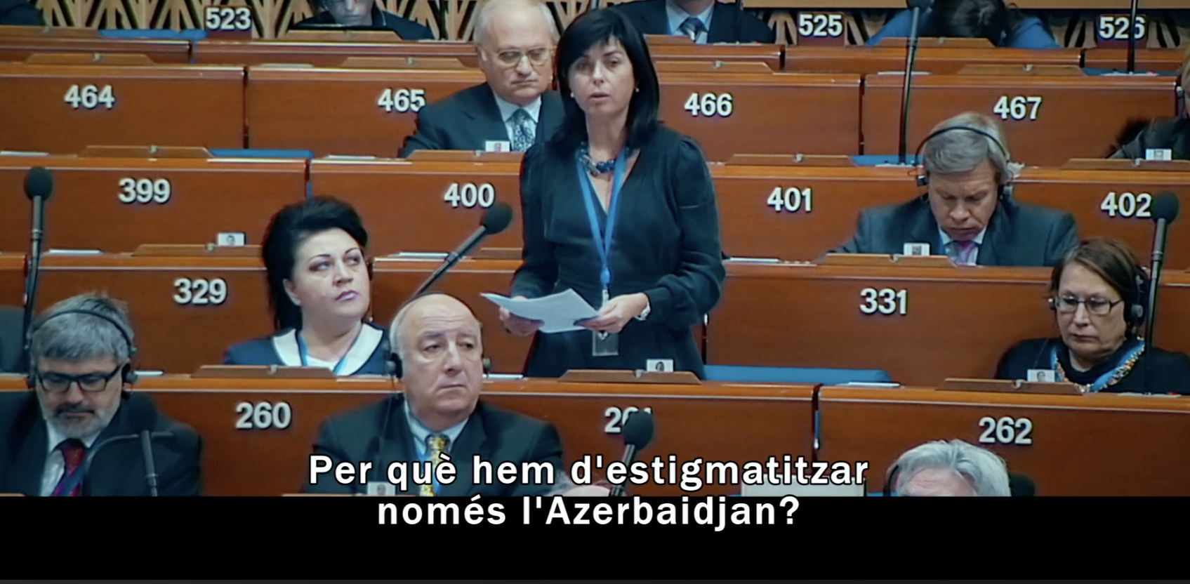 En el documental s’hi ofereix la posició de diversos diputats per il·lustrar aquell canvi de rumb. El blanqueig de la dictadura de la república asiàtica. Parlamantaris italians, francesos, espanyols… i fins i tot hi apareix la representant andorrana del moment. El reportatge no la identifica. Però no hi ha dubte que l’ex-ambaixadora i ex-ministra Meritxell Mateu era consellera general el 2012 i representava el Principat al Consell d’Europa. Mateu es demana per què s’ha d’estigmatitzar només l’Azerbaidjan. O sia, o tots o ningú.