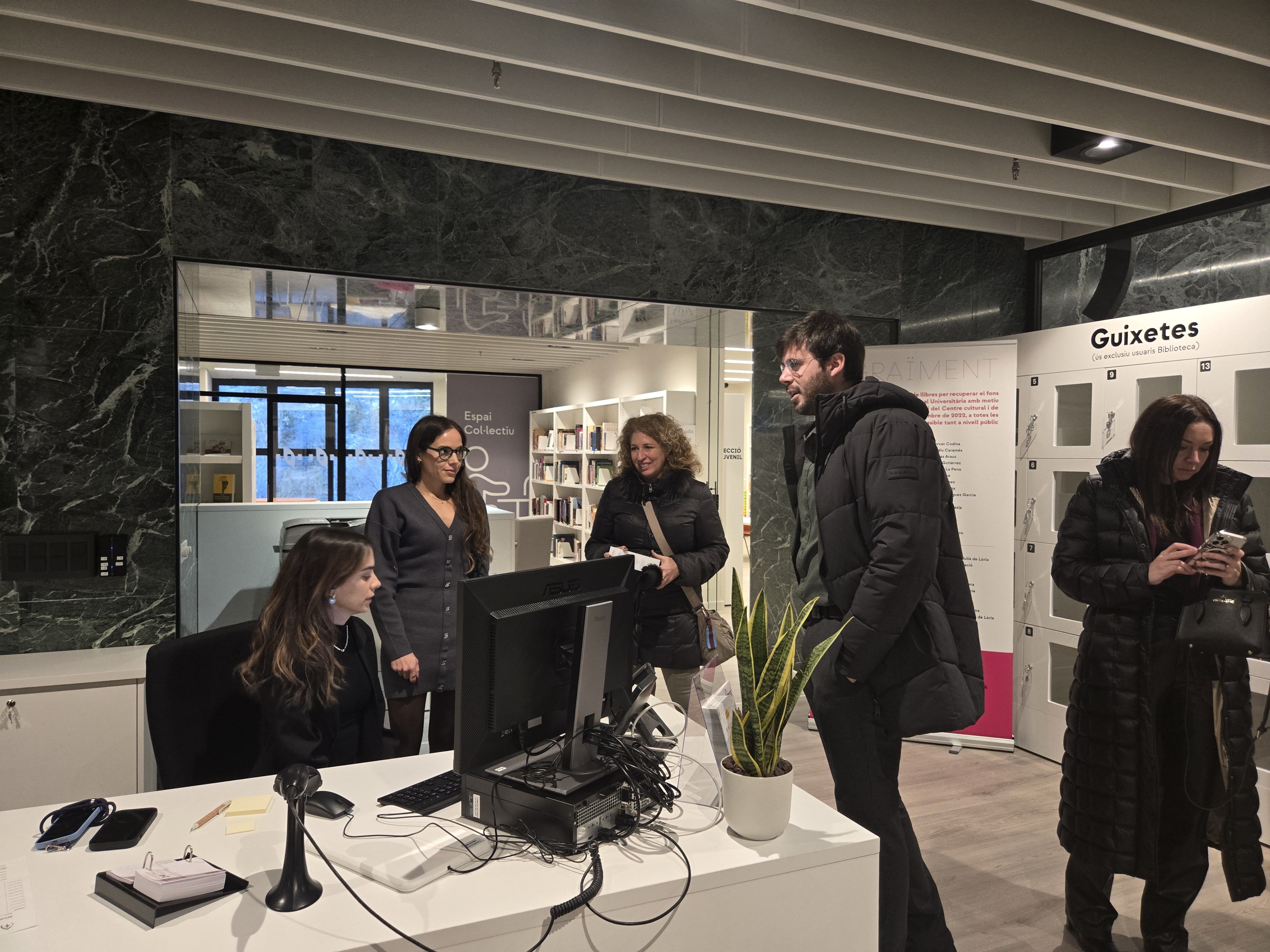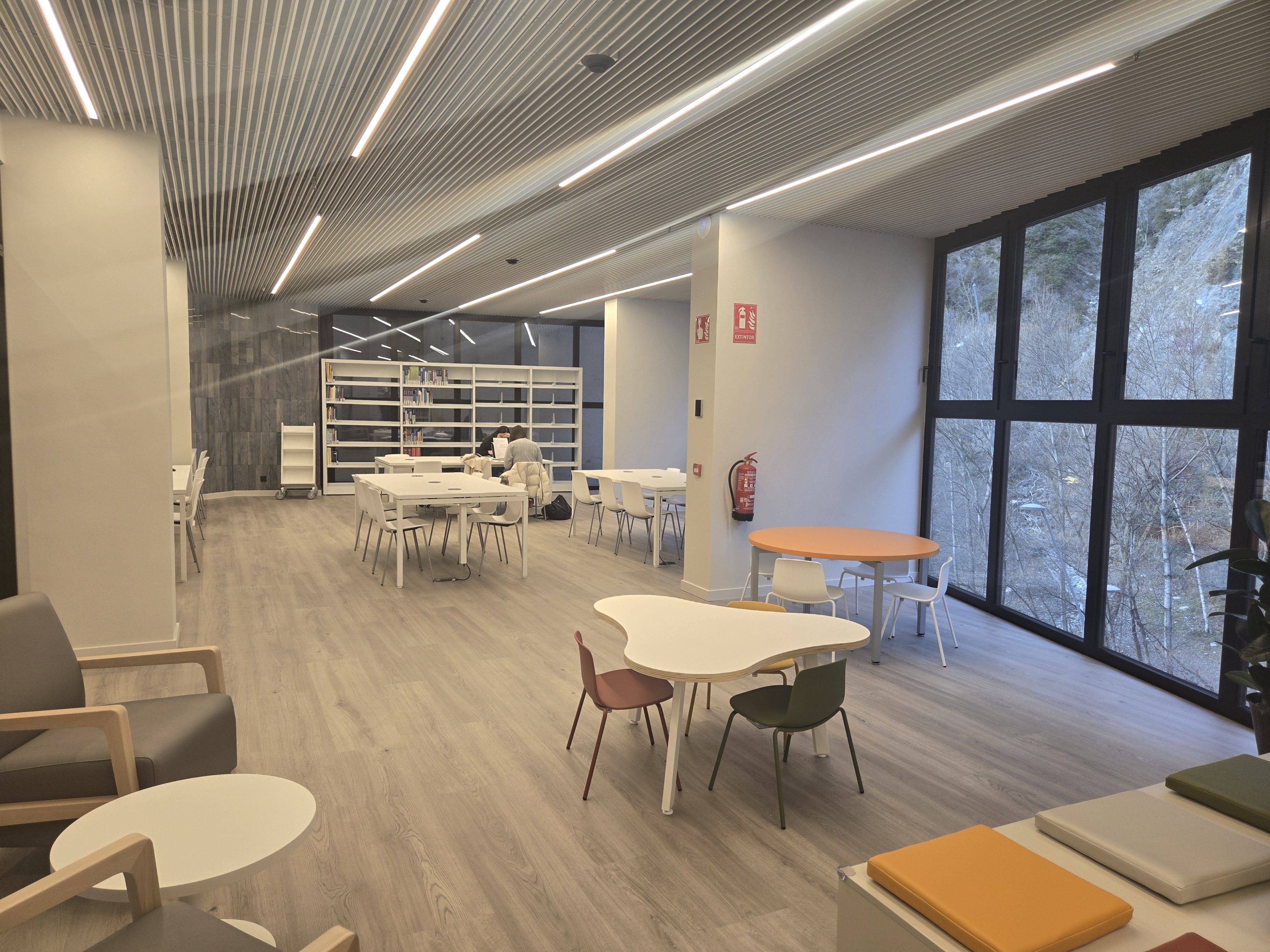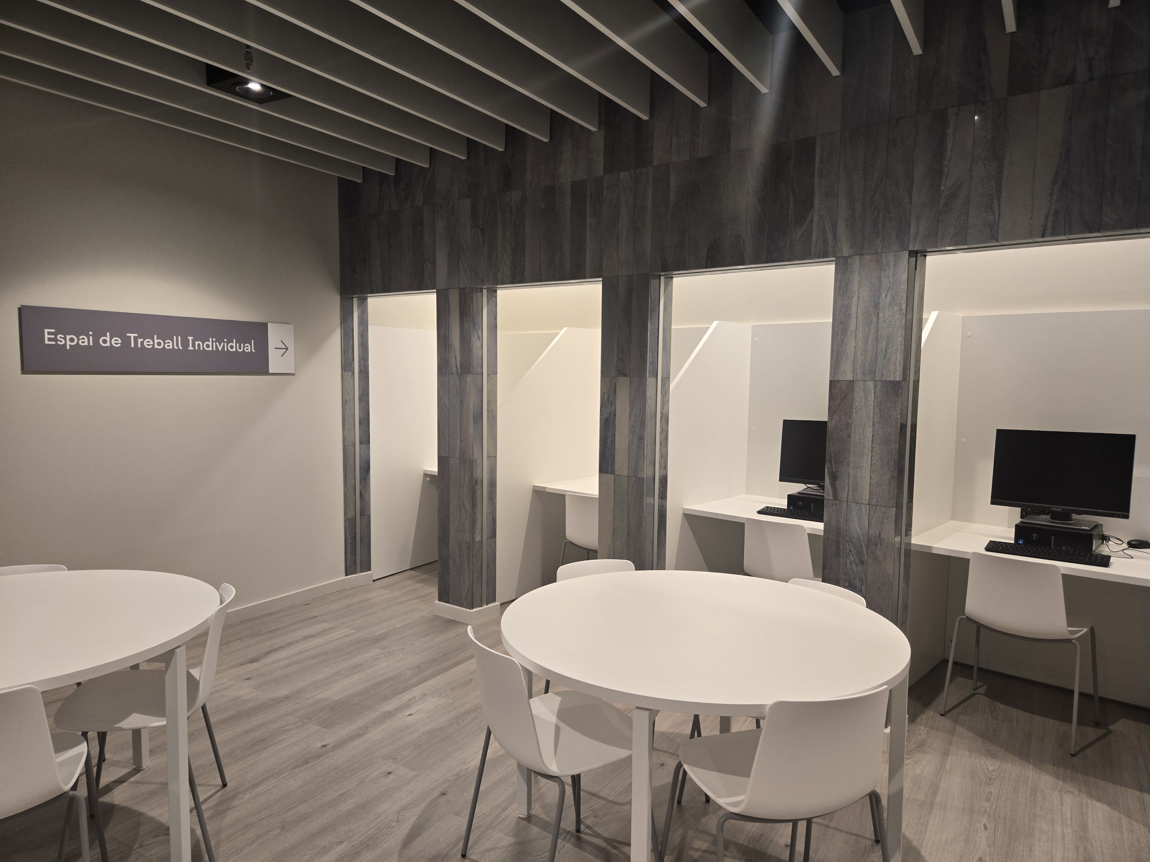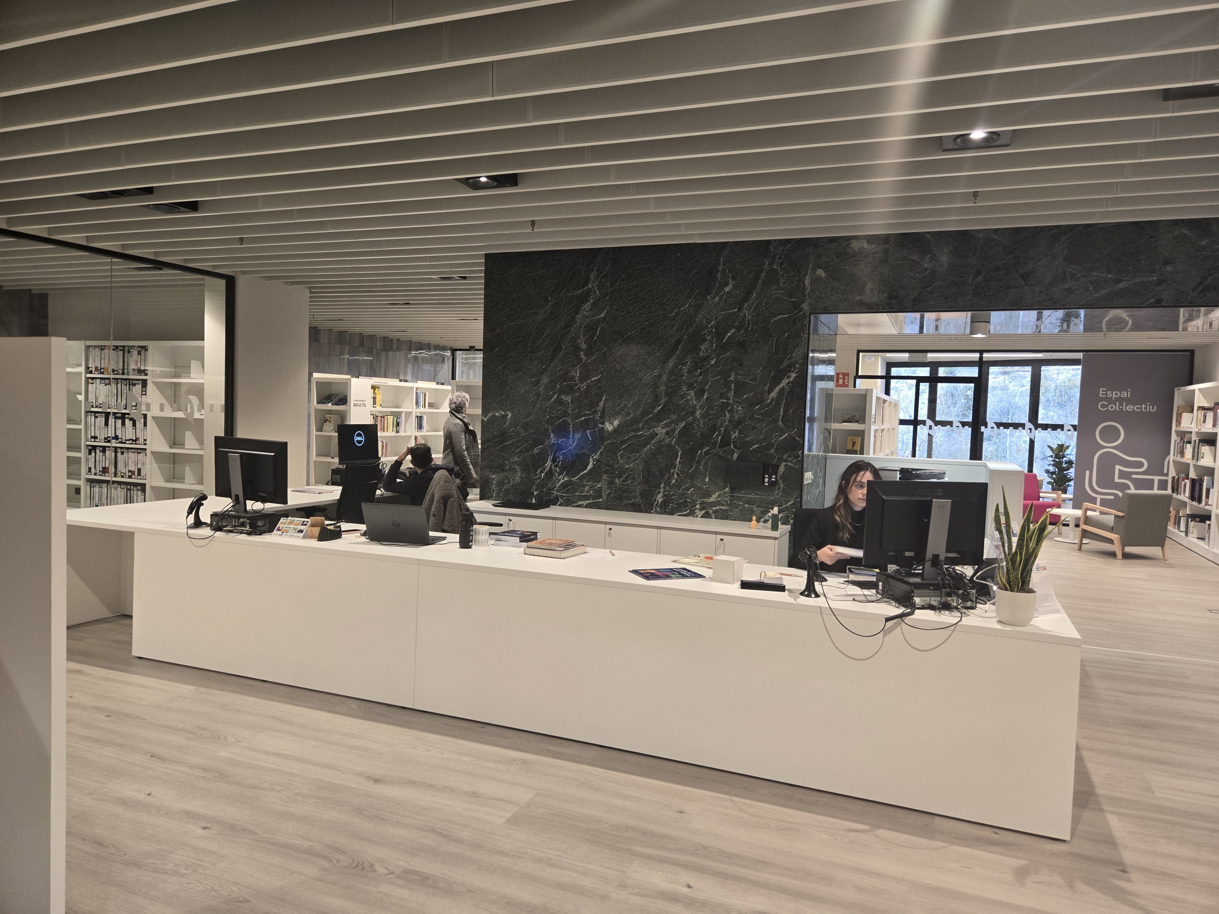 La biblioteca podríem dir que és una de les joies de la corona del vestíbul i l’indret que ha patit una renovació molt més elevada. La cap de Servei de Promoció Cultural, Laura Rogé destaca que “ens hem actualitzat i hem aconseguit un espai intergeneracional i amb un lloc dedicat al silenci on la gent podrà treballar tranquil·lament i un de més lúdic on aquest vespre hi haurà el primer concert poètic”. La Lara Baró és una de les treballadores i assegura que “teníem moltes ganes de tornar i com a casa no s’està enlloc”. A quarts de deu del matí ja hi havia les dues primeres usuàries que aprofitaven per estudiar. La Sara destaca que “és un indret molt adaptat per als estudiants i l’espai individual és idoni per preparar els exàmens”. A la taula l’acompanya la Téa qui coincidia que la nova biblioteca “és molt més moderna i còmoda”.