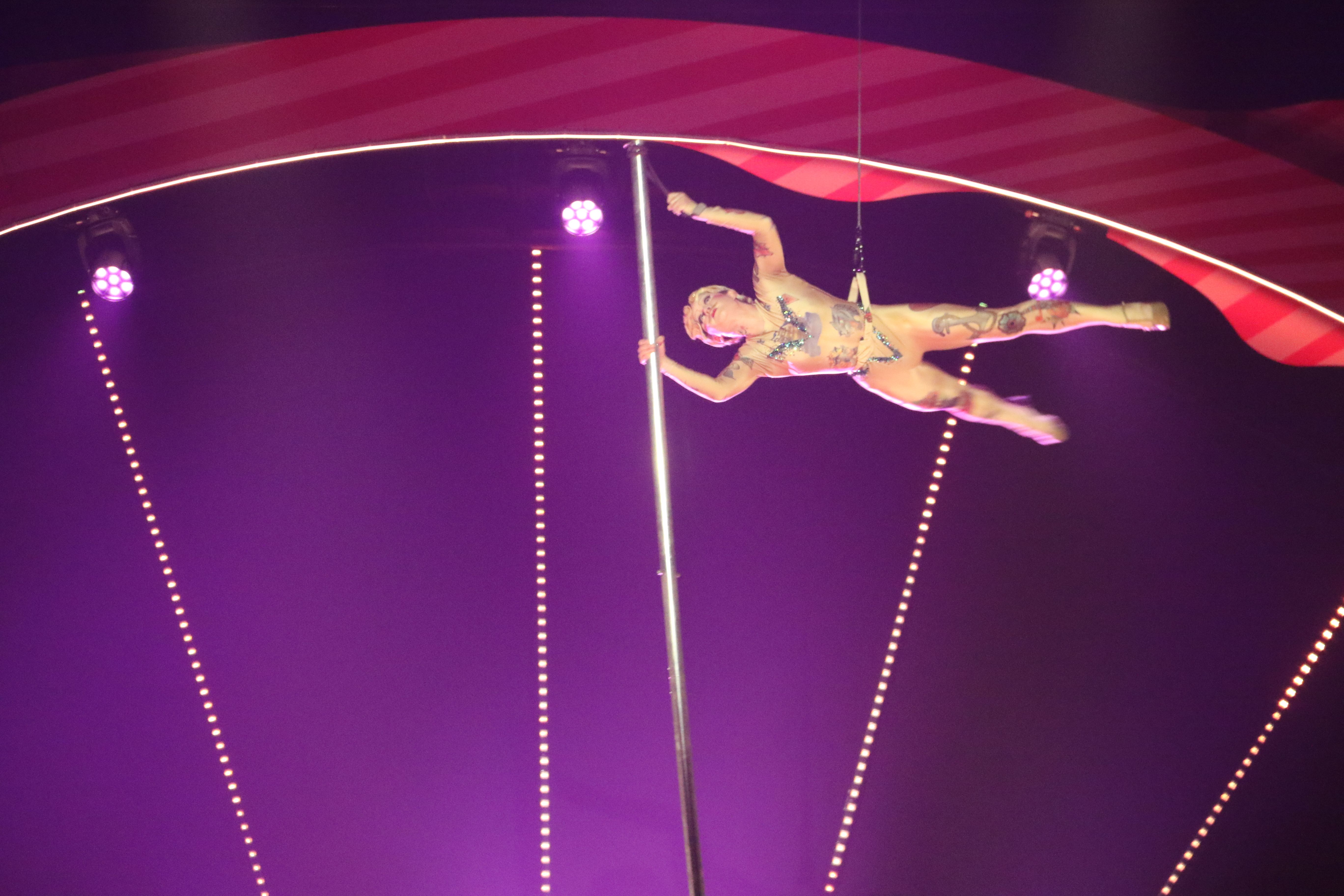 O el número final en què una mena de ‘quadra’ romana s’enlaira gairebé fins al sostre de la carpa per gronxar-se d’un cantó a l’altre i anar fent tirabols en l’aire esperant que el company de l’altre costat et pugui sostenir amb la força del seus braços col·locat en el trapezi de cap per avall. Són un parell o tres els números que fan fer picar de mans rabiosament. I que obliguen a entonar un ‘oooooooh’ sense concessions. La resta són somriures i bona estona. Que si els mostatxos marcats, que si les cares pintades. És una altra cosa.