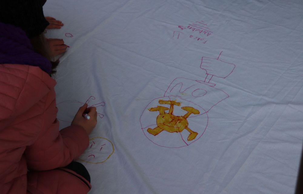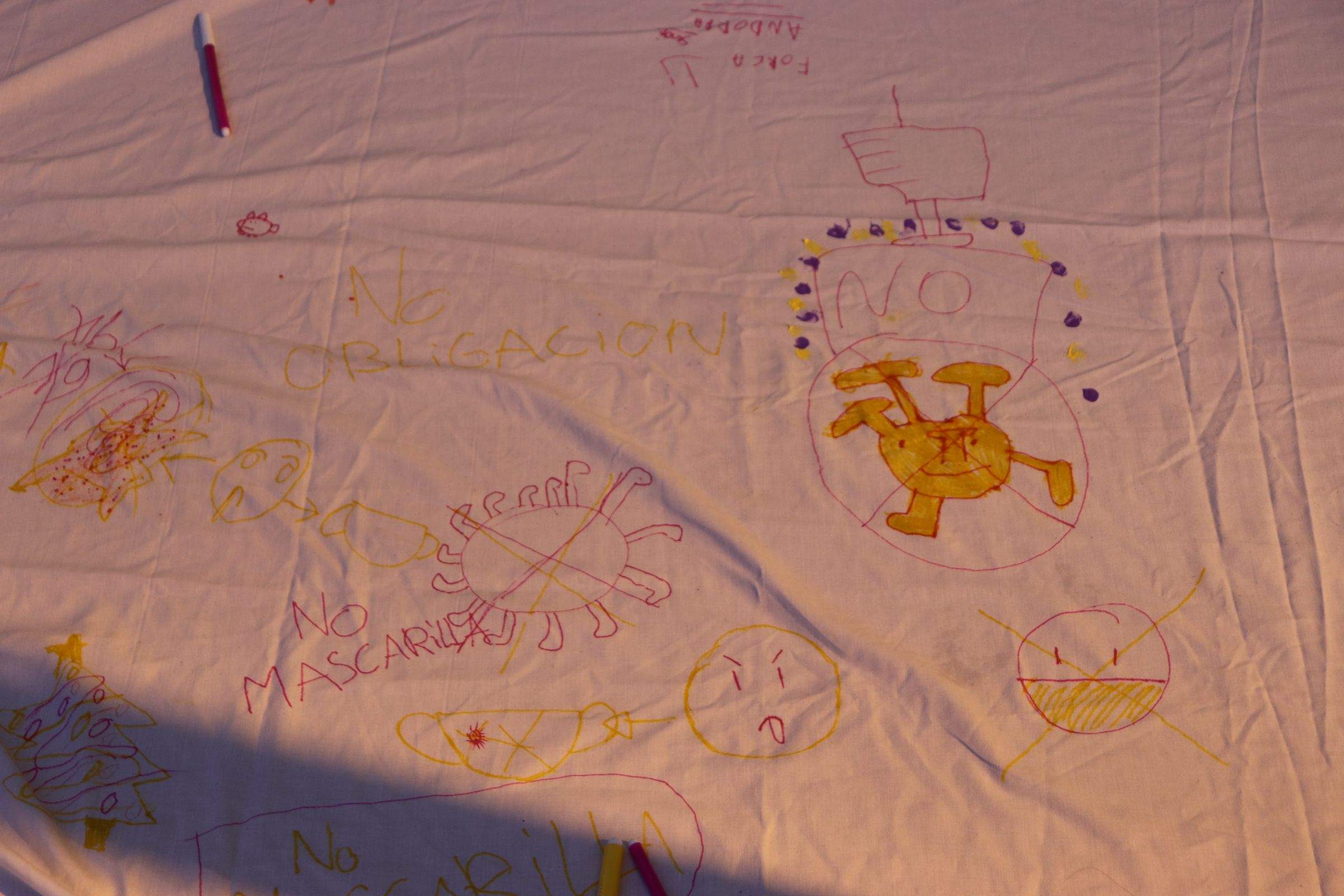 Les pancartes i el manifest que s’han llegit avui a la concentració alertaven sobre el perill de la vacunació infantil. Aquest dissabte, a més, s’han pogut veure uns quants nens allà també. Han estat fent el que fan els més petits, han pintat llençols (amb motius contra les vacunes), han fet bombolles de sabó i han jugat. Han participat de forma activa durant tota l’estona en què els més grans han estat a la plaça de la Rotonda. Han guanyat una mica de força, però res comparat amb les primeres manifestacions on van acudir un centenar de persones.