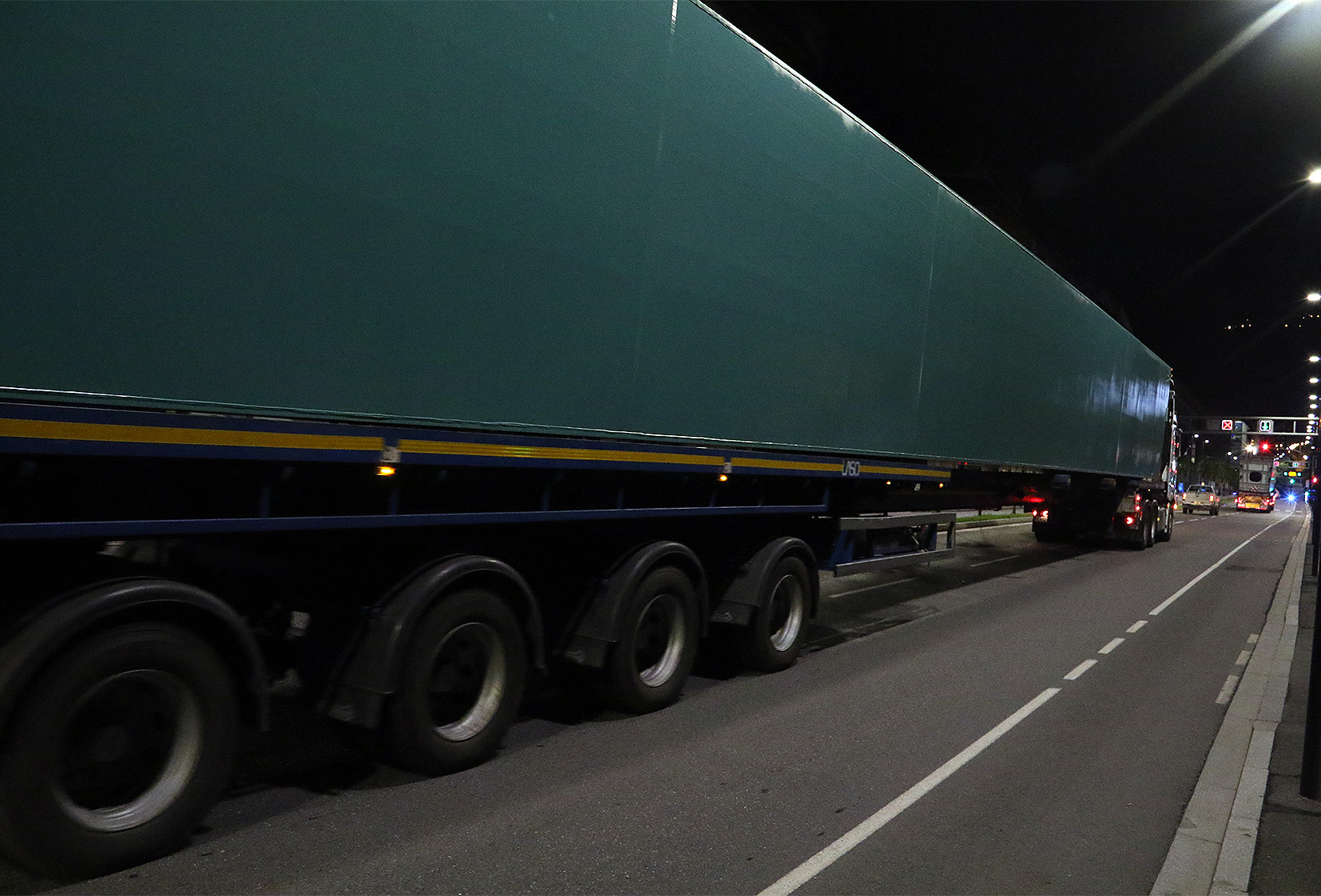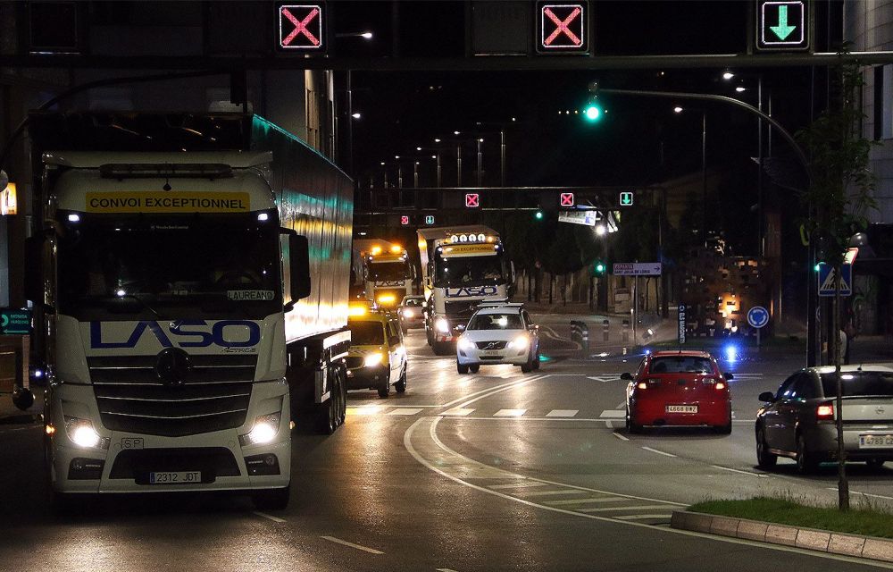 Són les bigues d’acer, buides de dins però prou pesants, que han de sustentar el tauler de la plataforma, “de diferents ordres i direccions perpendiculars”, segons l’avantprojecte que no s’està pas complint fil per randa. La remesa d’aquesta mitjanit era d’allò més important. Però no pas l’única. Diferents cotxes de la policia han acompanyat els vehicles de l’empresa d’origen portuguès Laso. També furgonetes de la mateixa firma s’intercalaven entre els vehicles de llargada especial. Asseguraven la logística.