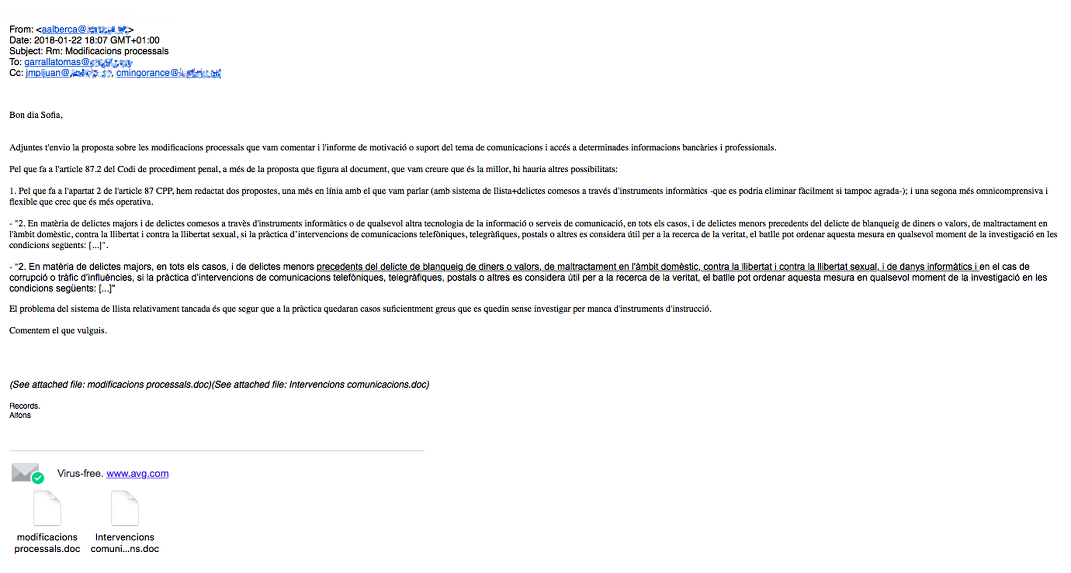 Les instruccions donades en el correu electrònic, les recomanacions fetes, potser no esdevenen unes ingerències entre poders. Però són clarament una pressió (presumpta, d’acord) en tota regla. Certament, les propostes de redacció que envia Alberca a la parlamentària sorgeixen d’algunes converses prèvies, d’uns contactes anteriors, però l’interès de la fiscalia és evident. Deixa clar el màxim responsable del ministeri públic, per exemple, que si la modificació legal estableix una llista tancada de delictes arran dels quals es poden intervenir les comunicacions sempre hi haurà allò que no es podrà investigar. En resum, si es fixa un llista sota la fórmula de ‘numerus clausus’ la barra lliure pretesa no serà possible. O, com a mínim, serà més difícil de fer-la realitat.