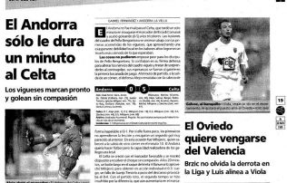 En setzes, va tocar en sort l’equip gallec. La diferència de categoria va quedar en evidència sobretot al duel d’anada, disputat a Andorra. Els viguesos es van imposar per 0-5. L’heroi d’aquella nit va ser el serbi Goran Milojevic, amb un ‘hat trick’. El valencià Juan Sánchez i el central Alejo Indias van completar la maneta. Aquell dia la gespa del Comunal va ser trepitjada també per altres mites del futbol espanyol com l’exblaugrana Eusebio o Michel Salgado, que més tard seria una peça clau al Reial Madrid.