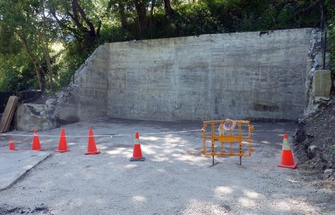 El mur del dipòsit de la Moleta preparat per a la intervenció.