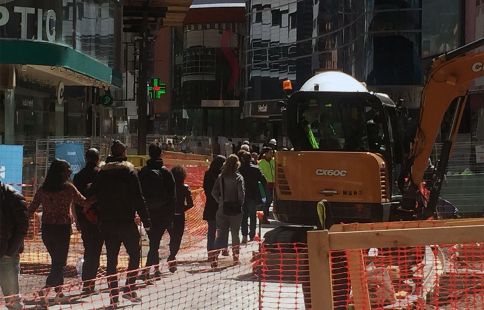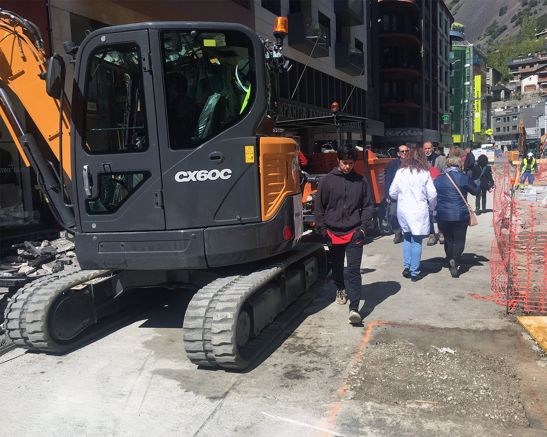 Veure transitar els vianants mentre màquines excavadores de relatives petites dimensions estan en plena feina, fins i tot movent-se en paral·lel al que ho fan les persones, s’està convertint en una imatge habitual. El pas de vianants no s’atura pas per molt que la maquinària o els operaris, per exemple, amb les seves eines perforadores estiguin treballant a ple rendiment. Tot es barreja.