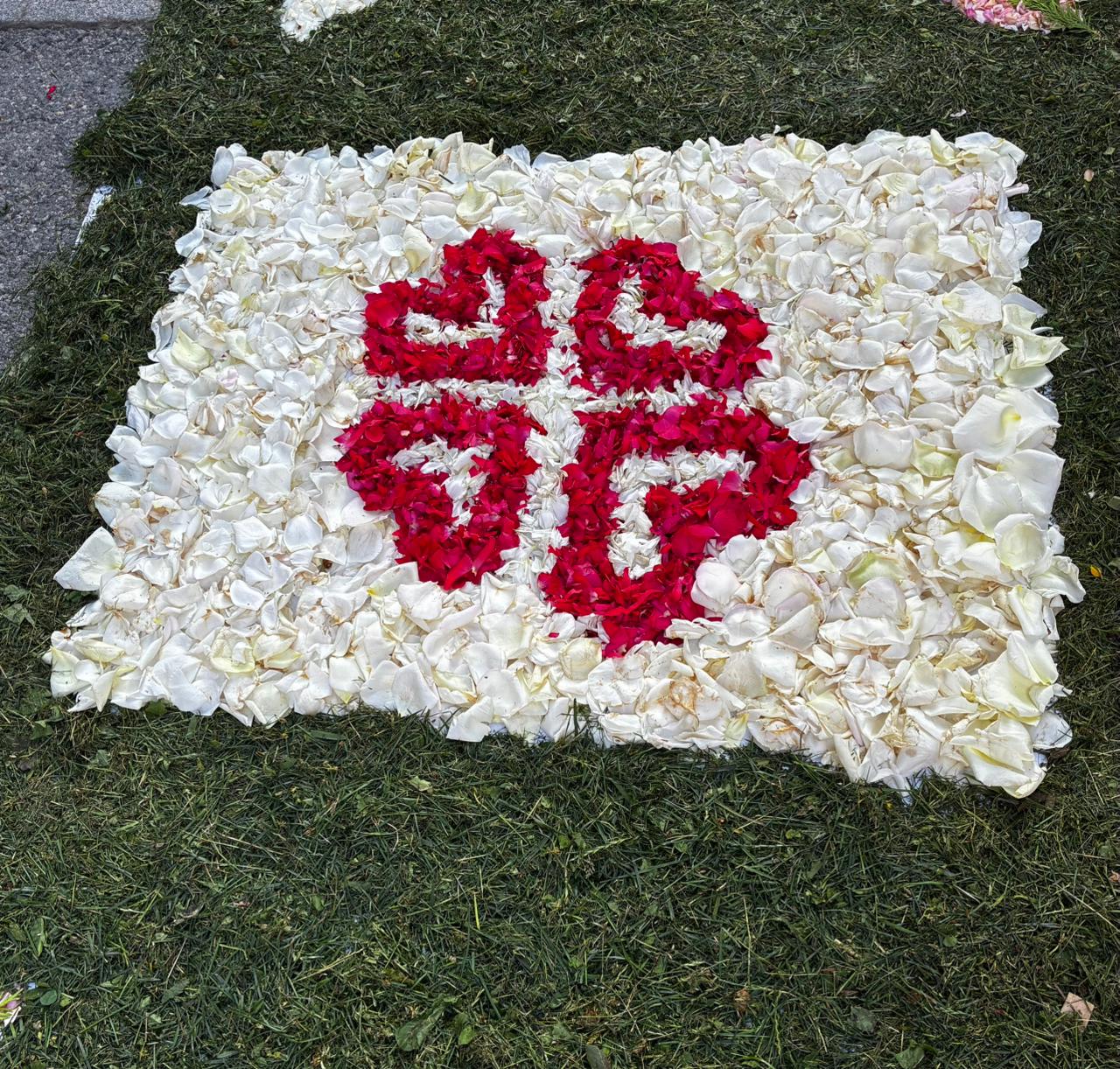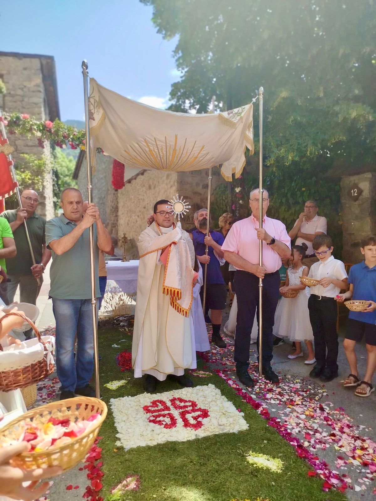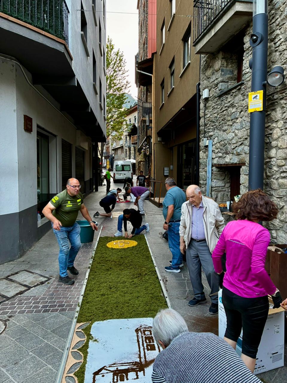 Com cada Corpus, fet que mossèn Álex s’ha encarregat també de recordar, se celebra el dia de Càritas. D’aquí que en la catifa llarga el logo d’aquesta ONG cristiana també hi hagi tingut una presència destacada. Un recordatori conseqüent. I la voluntat d’anar mantenint cada any la tradició ara que s’ha recuperat i, si es pot, poder-hi anar afegint algun element més. I, almenys, anar modificant els dissenys de la catifa.
