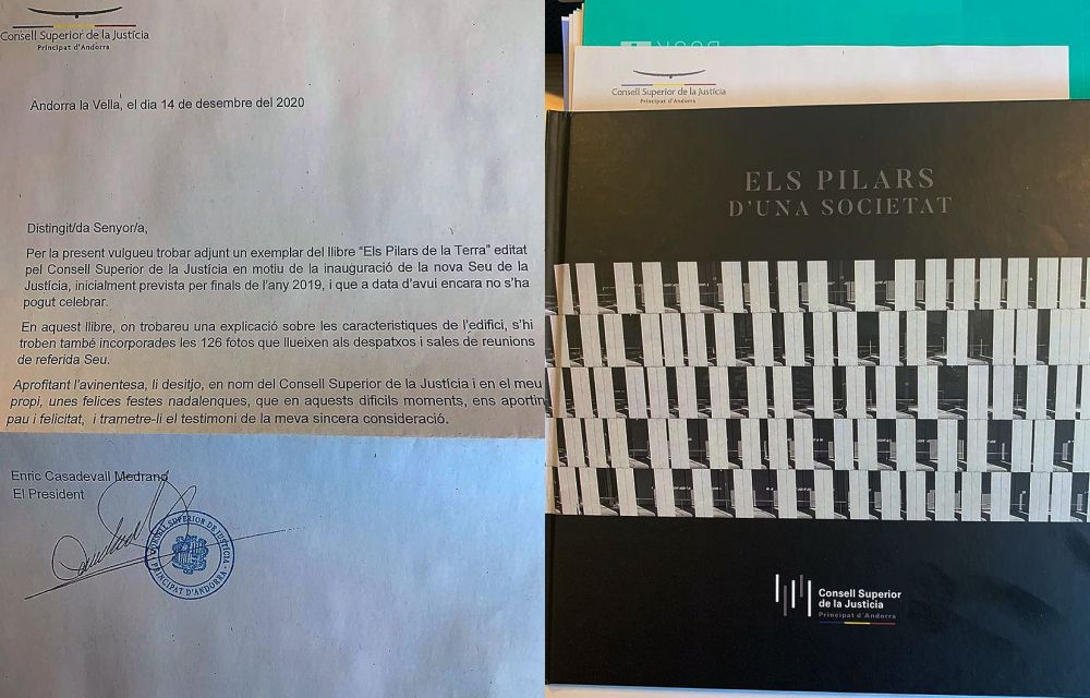 El llibre en qüestió s’ha editat en motiu de la inauguració de la nova Seu de la Justícia “inicialment prevista per a finals de l’any 2019 i que a data d’avui encara no s’ha pogut celebrar”. Entre altres coses perquè les noves dependències no van ser operatives fins al setembre d’aquest 2020 i perquè, a més a més, les condicions actuals imposades per la pandèmia no ho fan recomanable.
