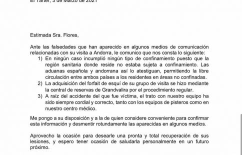 I la informació que confirma és que “en cap cas va incomplir cap tipus de confinament ja que la regió sanitària on vostè resideix no estava subjecta a confinament. Les duanes espanyola i andorrana així ho testifiquen, permetent la lliure circulació entre tots dos països als residents en àrees no confinades”. També deixa clar el CEO de Grandvalira-Ensisa que “l’adquisició del forfet d’esquí del seu grup de visita es va fer mitjançant la central de reserves de Grandvalira pel procediment regular” i que arran de l’accident “del qual va ser víctima, el tracte amb el nostre equip ha estat sempre cordial i correcte, tant amb els equips de pisters com en el nostre centre mèdic”. En fi, salvada de ‘Sálvame’.