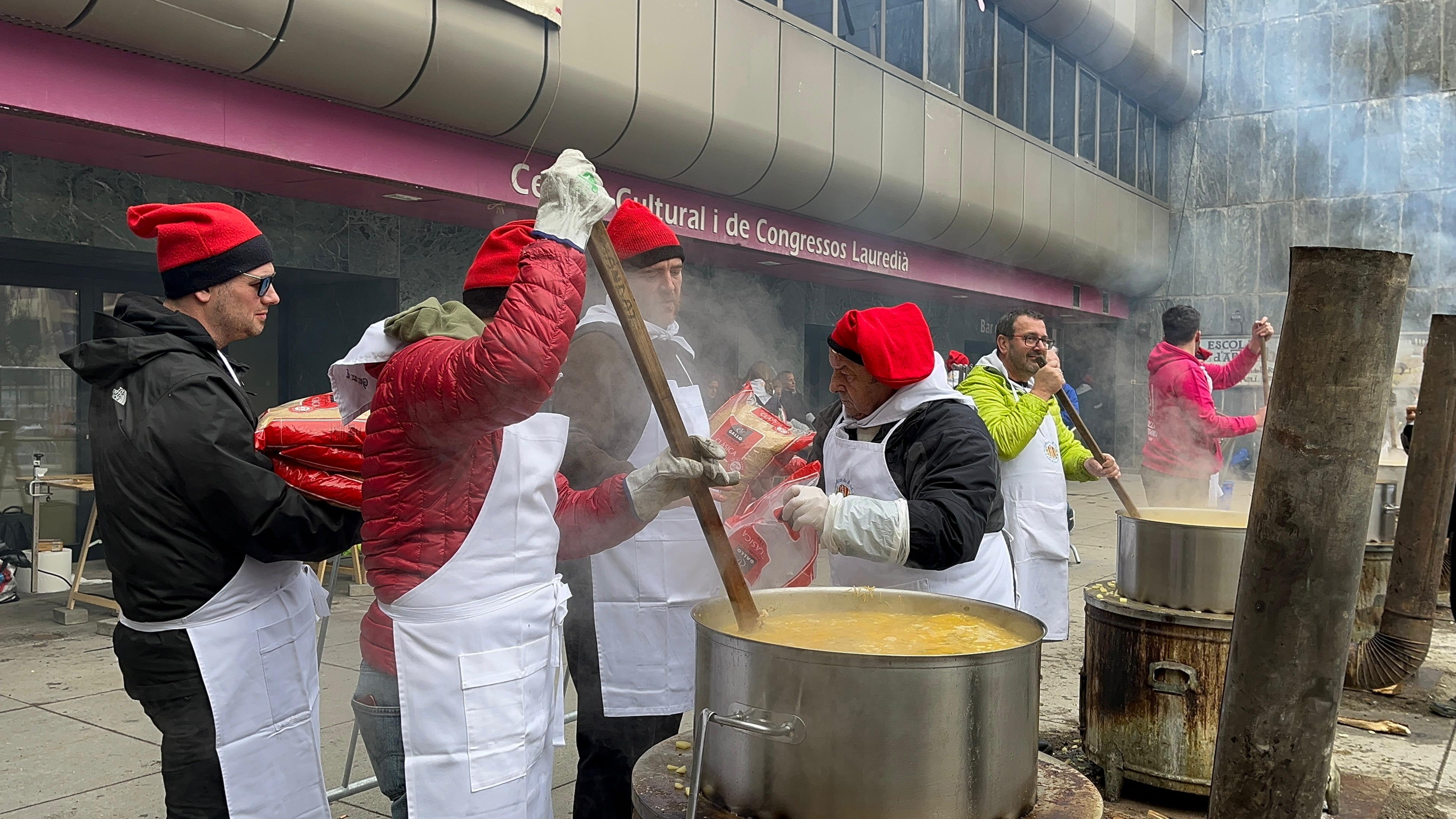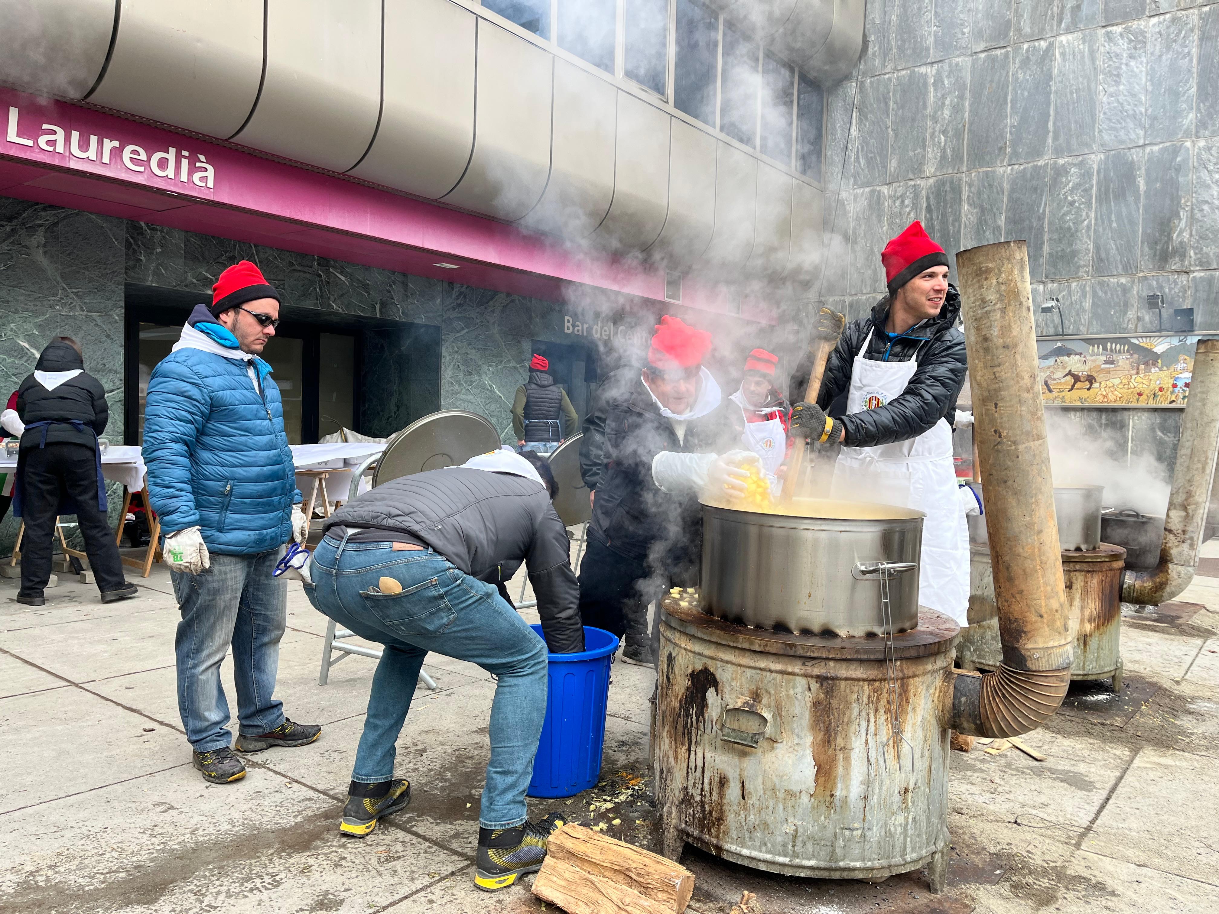 Des de ben d’hora el matí una seixantena de voluntaris s’han reunit a la plaça de la Germandat per encendre el foc i començar a preparar la tradicional escudella. Una feina que ja havien començat el dia anterior, preparant tota la carn i la verdura. L’objectiu era fer unes 2.300 racions d’escudella per tots els lauredians i lauredianes i residents del país que es volguessin apropar aquest migdia a la plaça Germandat.
