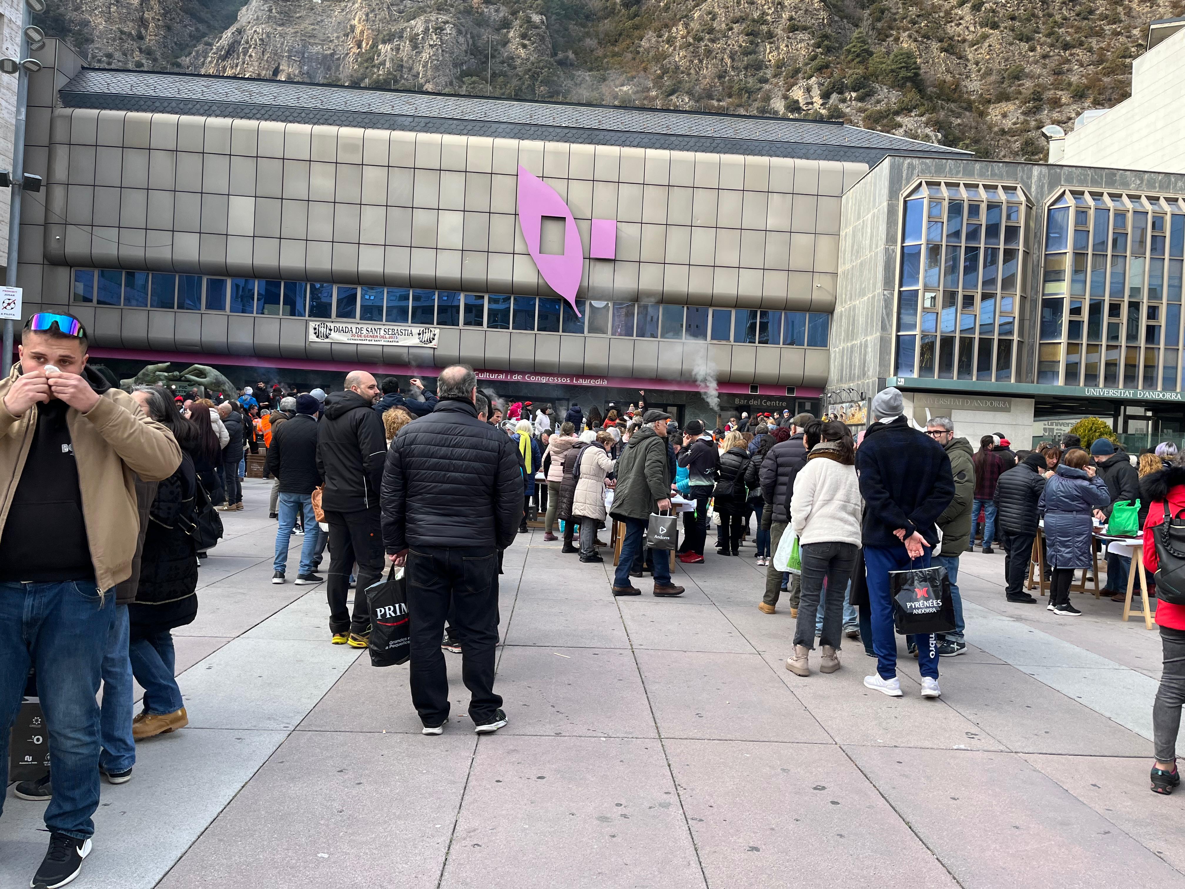 Una hora abans que es comencés a repartir, ja hi havia una bona cua a la plaça Germandat esperant la seva ració amb el plat commemoratiu o els seus tàpers per emportar-se a casa. La festivitat ha arrencat aquest matí amb la tradicional missa a l’església parroquial i posteriorment s'ha fet l'assemblea de la Germandat de Sant Sebastià.