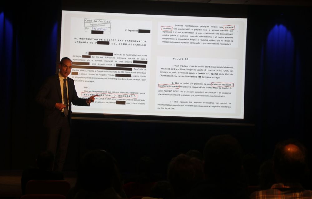 “Ho demana perquè segons aquest client i aquest advocat, el cònsol de Canillo ha fet unes declaracions que demostren una enemistat contra aquest client, que en cap cas conec personalment, i que constitueixen la desqualificació pública prèvia de qualsevol resolució administrativa. Per tant demana la recusació, l’abstenció i apartament immediat del cònsol de Canillo d’aquest procés”, ha anat explicant Alcobé amb l’escrit del jurista en qüestió projectat a la pantalla. Tot venia perquè “fa sis mesos, en aquesta sala, jo vaig denunciar infraccions urbanístiques”.