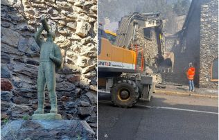 I l’únic que s’haurà salvat del foc serà l’excursionista, que amb aquest nom es coneixia popularment l’escultura que hi havia col·locada a l’inici de l’escalinata que quedava entre dos dels principals edificis -els dos primers seguint el sentit ascendent de la carretera- ara pràcticament derruïts. Justament dijous a la tarda, poc abans que es comencés l’enderroc parcial de les construccions, algú va parar compte que hi havia la peça de bronze encarregada per dos dels primers promotors de la planta embotelladora, Antoni Ubach i Josep Miño, a Sergi Mas. I abans d’aterrar res, es va retirar la peça, se la va col·locar en la caixa d’una camioneta del comú i és ara la corporació qui la guarda en algun dels seus magatzems. Quin serà el seu futur és molt aviat per saber-ho.