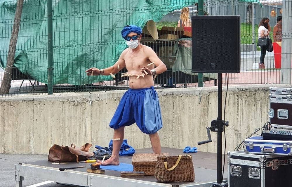 El protagonista ha fet diverses actuacions, com ara jugar amb el foc o amb serps de mentida, ficar-se pinces d’estendre la roba pel cos o trepitjar patates fregides simulant que eren vidres. A més a més, també anava interactuant amb el públic, fent acudits o demanant col·laboradors.