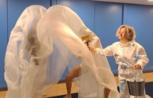 I com ho aconseguirà? Doncs l’obra fa una paral·lelisme amb tots els estats de l’aigua: “la pluja, la tempesta, els rius i els llacs”; amb el que és el procés de creació d’un artista: “el seu començament, el pensament de l’obra, el caos artístic i la peça acabada”, detalla. A més, el color també és un element molt important, ja que utilitzarà tonalitats blaves que cobriran aquest “llençol de grans dimensions blanc”. Una vegada acabada la ‘performance’, que dura uns 25 minuts, la tela es col·locarà en una estructura, on amb l’ajuda d’uns ventiladors, i acompanyat d’una música, “es farà volar aquesta tela simulant una onada”, explica.