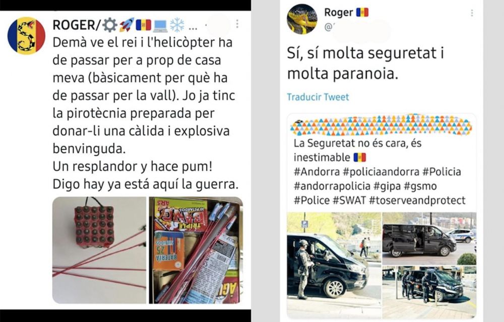 “Demà ve el rei i l’helicòpter ha de passar per a prop de casa meva (bàsicament per què ha de passar per la vall). Jo ja tinc la pirotècnia preparada per donar-li una càlida i explosiva benvinguda. Un resplandor y hace pum! Digo hay ya está aquí la guerra”, pregonava la piulada conflictiva acompanyada amb un parell d’imatges de pirotècnia que va acabar desapareixent. El tal Roger, que així es denomina el ‘tuitaire’, hauria rebut la visita policial.