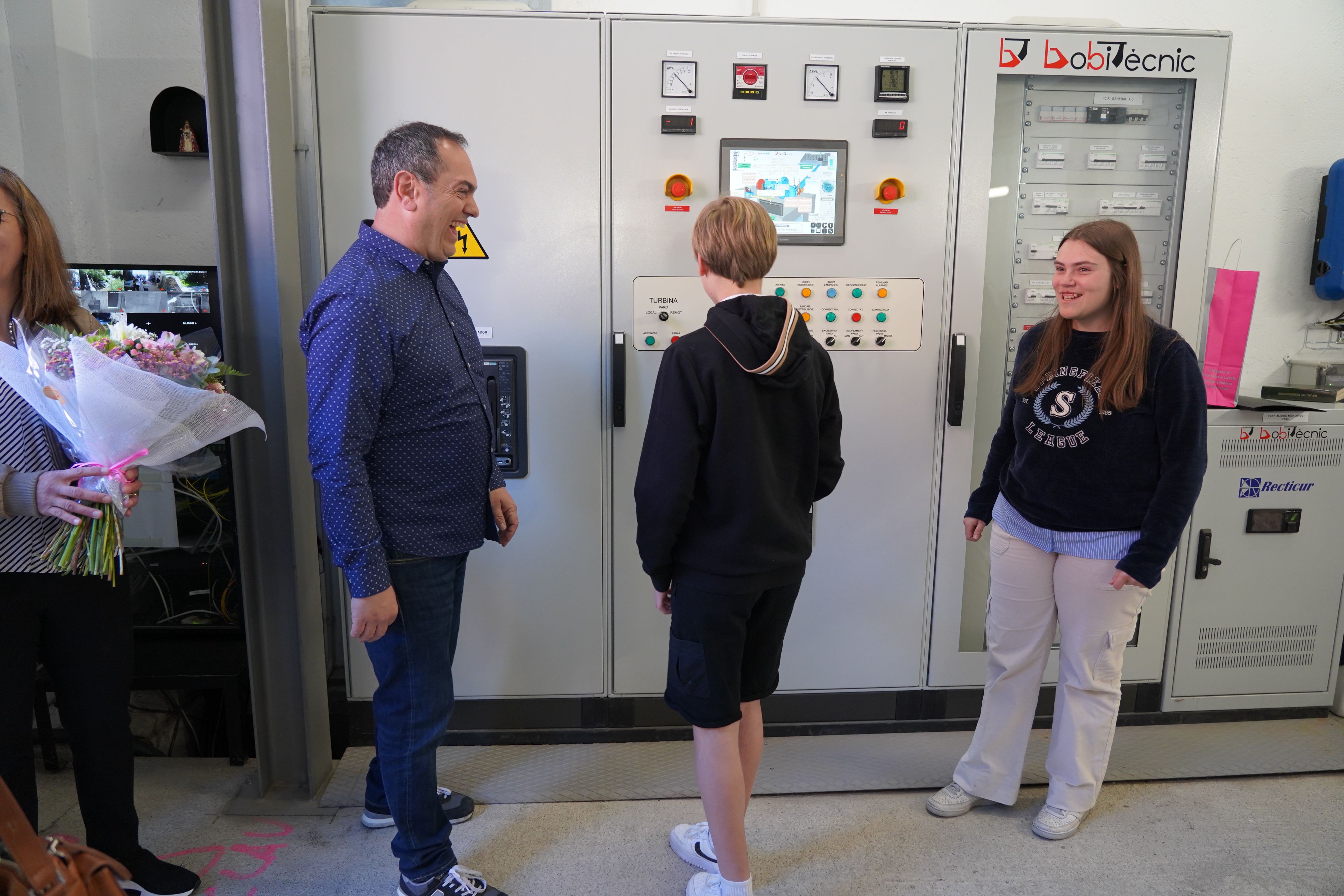 Els fills i la dona de Grau observen la placa que dona nom a la minicentral.