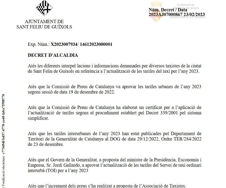 El decret, a més fixa unes tarifes que no es corresponen amb les de Sant Feliu de Guíxols ja que són les d'Andorra. El fet ha causat lògicament tot tipus de comentaris i ha ocupat un espais destacats en la premsa local i en la catalana com ara El Punt Avui. És cert que a la Costa Brava hi ha un bon nombre d'andorrans que hi tenen una segona residència i que una de les personalitats amb xalet a Sant Feliu de Guíxols,des de fa molts anys, és la resident Carmen Cervera però d'aquí a que un ministre andorrà autoritzi un canvi de tarifes del servei de taxi hi ha un món.