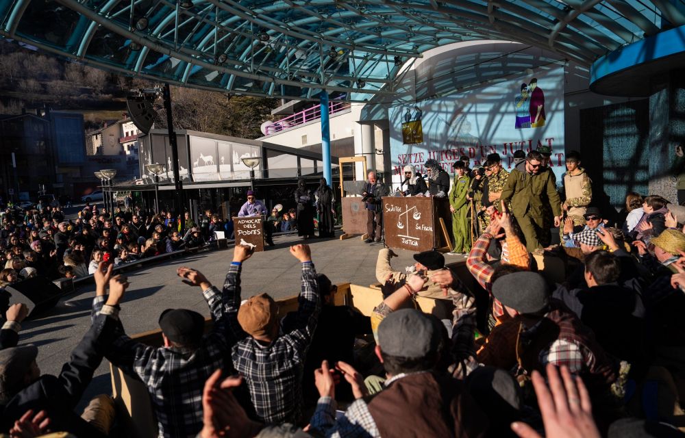 A l’escenari, el fiscal, el jutge i el gran advocat dels pobres, que ha recuperat la figura de l’excònsol menor, Jean-Michel Rascagenres. Casualment (o probablement no) el cap dels contrabandistes era el seu fill, l’actual conseller Benjamí Rascagneres, sota el malnom de ‘El Sis Dits’. Al llarg de la peculiar vista, la música ha estat també protagonista, amb versions ‘encampadanes’ de títols populars com ‘Yo te esperaré’, de Calí i el Dandee, i del ‘CotixCoti’ de The Tyets. Tots dos, evidentment, amb lletres que feien broma de diferents aspectes de l’actualitat andorrana. Així, han tornat a rebre temes com la problemàtica de l’habitatge o el cost de la vida. I també s’han fet al·lusions al cap de Govern, Xavier Espot, o a la ministra Conxita Marsol.