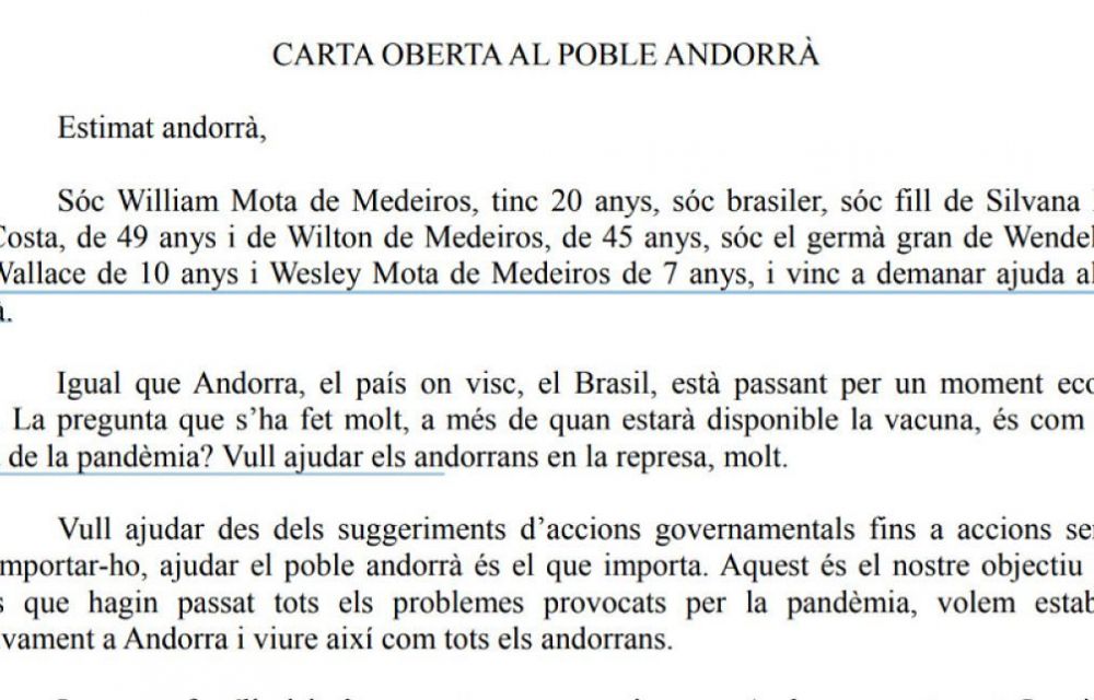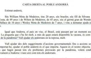 En l’escrit, remarca que, “igual que Andorra, el país on visc, Brasil, està passant per un moment econòmic delicat” i indica que molts es pregunten com serà “la represa de la pandèmia”. Assegura que “vull ajudar els andorrans, molt”.
