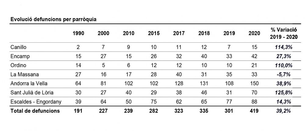 Per parròquies, es deia a l’inici, l’impacte de la pandèmia és brutal a Sant Julià de Lòria, on el 2020 es van més que doblar el nombre de morts. Si el 2019 van morir 31 residents en aquesta parròquia, l’any de la Covid van ser 70, un increment percentual de 125,8%, només comparable als haguts a Canillo i Ordino, encara que en xifres absolutes, és clar, l’impacte va ser molt menor. A Canillo es va passar de 7 defuncions a 15 (un increment del 114%) i a Ordino es va saltar de 10 a 21 defuncions (augment del 110%). Curiosament, a l’altre extrem hi queda la parròquia de la Massana, on el 2020 hi va haver menys defuncions que l’any precedent: 33 per 35. Evidentment, on hi va haver per decessos va ser a Andorra la Vella: 150, amb un increment real de 42 defuncions.