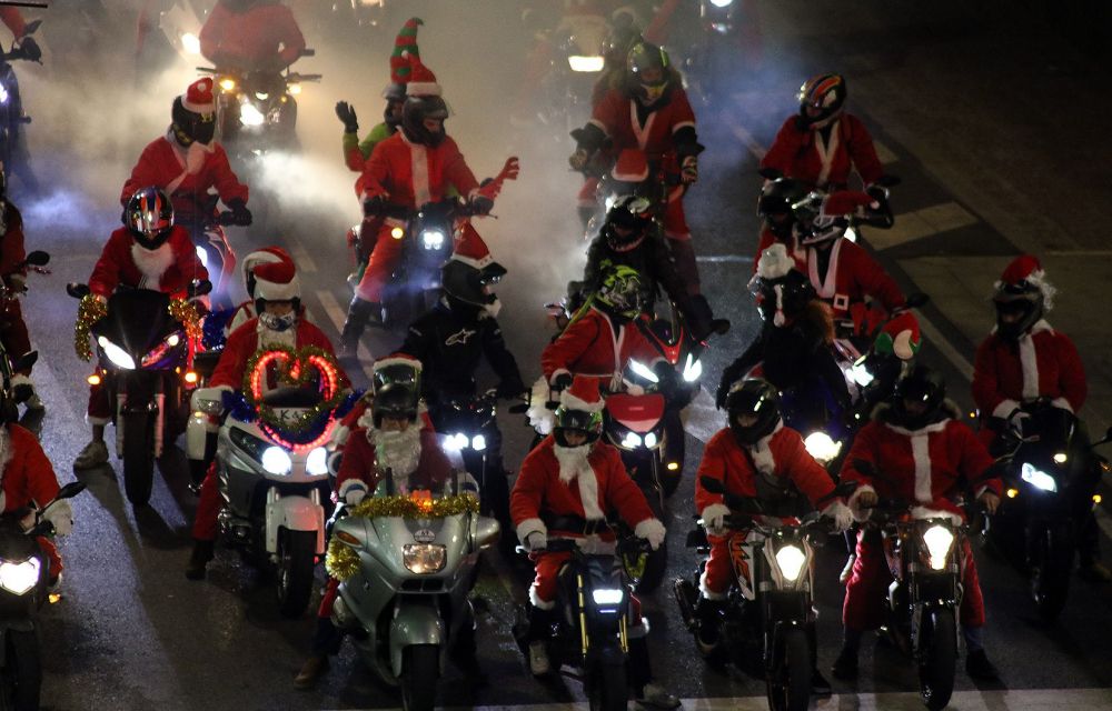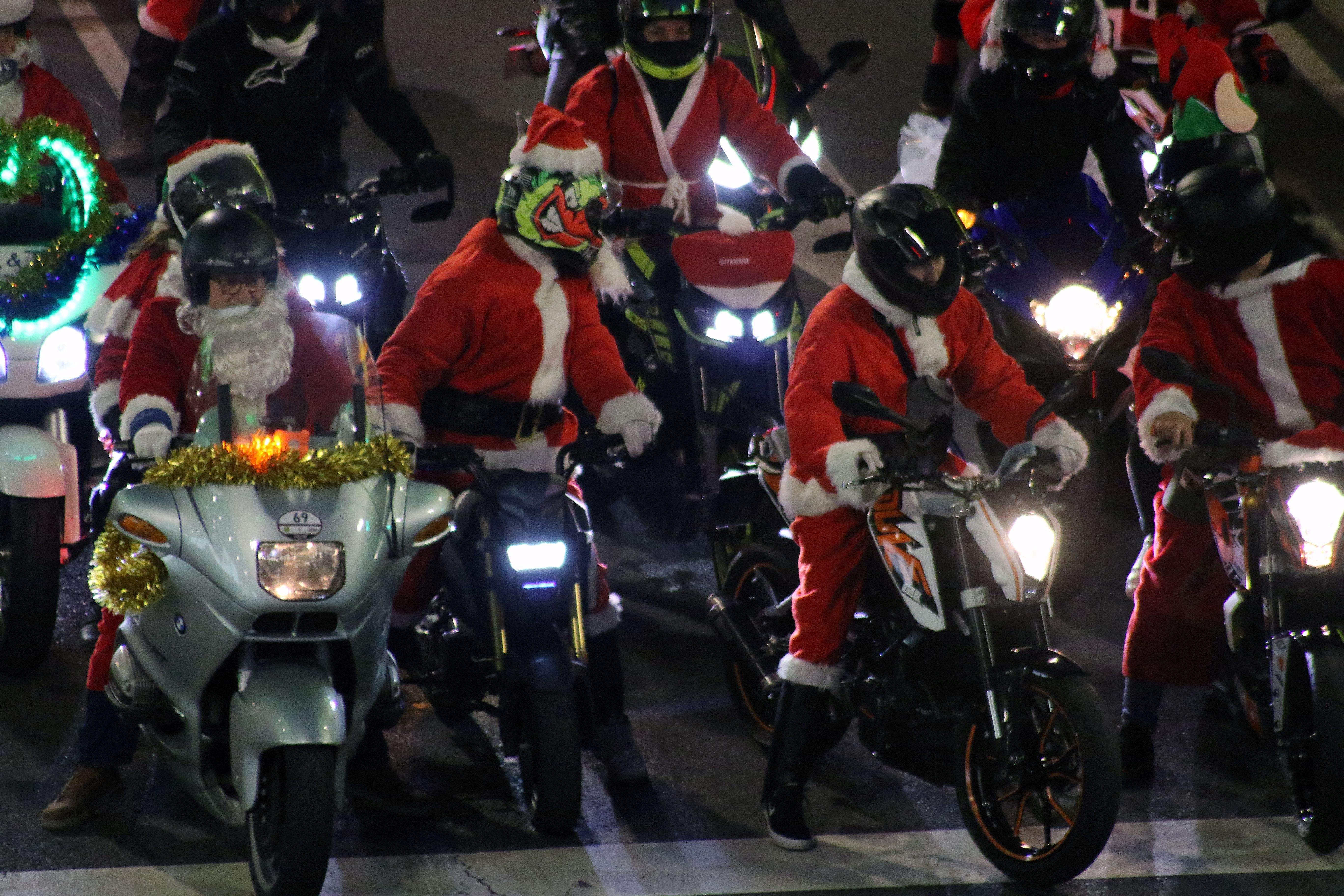 Si han notat un excés de fum o de ferum a pneumàtic cremat, no s’estranyin ni poc ni gens. La culpa és d’aquests Pare Noël motoritzats. I és que, poc o molt, tots els pilots i acompanyants de les motocicletes anaven engalanats com si de Santa Claus es tractessin. Potser algun elf. Vestits vermells, gorres amb borla blanca al capdavall i llargues barbes blanques. I tos plegats sobre dues rodes i fent bramar motors i cremant els pneumàtics.