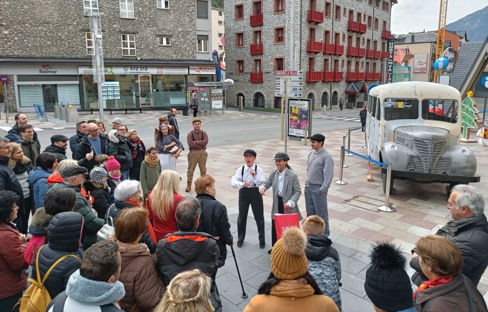 L’hotel Carlemany era el punt de partida. Després d’unes paraules de la cònsol major i candidata a la reelecció, Rosa Gili, per introduir la representació, la trentena d’assistents (totes les places plenes en les dues funcions que s’han fet i fins i tot, llista d’espera) a la representació teatral ‘De pont a pont’ s’han desplaçat fins a la placeta del Madriu, tunejada per a l’ocasió, tenint en compte les obres que s’hi fan en el marc del projecte Caldes.