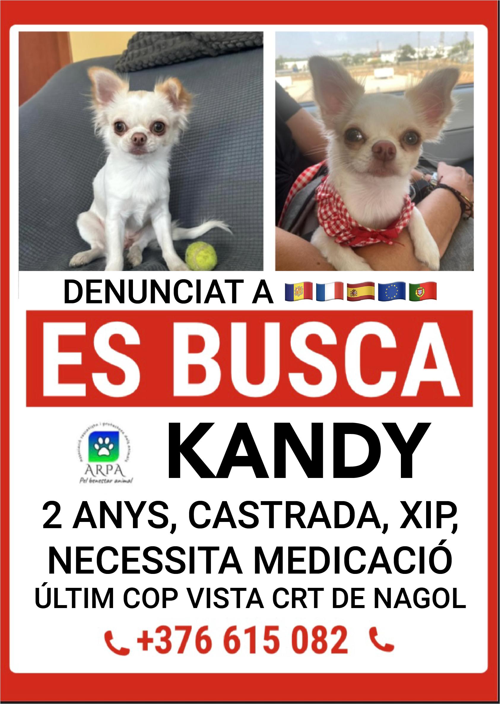 Després d’aturar-se durant la nit, la recerca s’ha reprès aquest matí. S’han fet cartells i s’han repartit per diversos punts del país, especialment a Sant Julià. S’ha informat de la situació a veterinaris espanyols i d’Andorra. També als mossos d’esquadra. Els agents de circulació de Sant Julià estan al corrent de la situació i també els banders i el centre de protecció d’animals. En fi, la gossera. I per acabar-ho d’adobar, s’ha formalitzat una denúncia per la pèrdua a la policia. Per ara, queda poc més que fer precs per la Kandy.