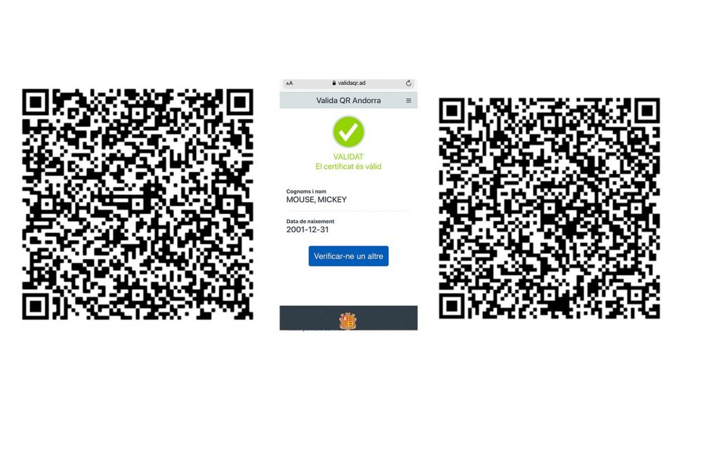 L’Altaveu ho ha comprovat amb dos codis diferents, els que il·lustren aquest article, que li han estat facilitats ja elaborats (i a partir de www.validaqr.ad). Tots dos són validats per l’aplicació nacional de comprovació de QR. En un apareix el nom d’Adolf Hitler -cert, una mica de molta mala llet- i en l’altre el d’un personatge moltíssim més simpàtic i agraït: Mickey Mouse. I l’eina informàtica ni s’encalla ni res. Dóna per bo el codi i convida a validar-ne un altre. Pim pam.