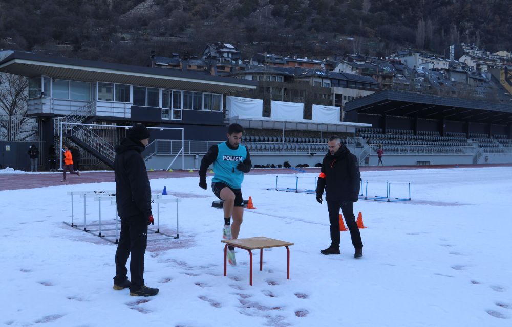 L’agent major Bruno Modesto, com ja va fer fa quatre mesos, ha fet cinc cèntims del que havien de fer. El mateix que al setembre. Amb neu i gel. Però, diu Modesto i no li falta raó, de neu i gel si acaben sent policies també en trobaran al carrer. De fet, recordava l’agent, de proves se n’han fet diluviant o amb una calor horrible. De tot hi ha a la vinya del Senyor i al dia a dia del policia. De la policia. Un cos que vol dotar-se de més personal per combatre reptes com pot ser el del contraban al Pas de la Casa i d’anar-se acostant a la xifra mítica dels 300 funcionaris. De moment, al cos hi ha satisfacció per haver pogut atraure una trentena de candidats en una convocatòria extraordinària. En tan poc temps, s’han inscrit 65 persones per mirar de ser policia. Sobre la pista del Comunal, això sí, aquest dijous n’hi havia quatre menys dels previstos. Fa quatre mesos en van fallar deu.