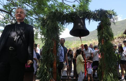 La reconstrucció de Jesús Maria Romana ha estat beneïda aquest migdia en la petita esplanada adjacent a la capella de Sant Romà de Vila, que ha acollit el que fins a l’esclat de la pandèmia era el tradicional aplec de Pentecostes. L’arquebisbe d’Urgell, Joan Enric Vives, ha estat el mestre de cerimònies, encara que qui domina del tema és el conservador del museu Casa Cristo i alhora campaner encampadà Robert Lizarte. Ell és en gran part l’ànima de la reconstrucció de la campana. Viu la cosa com pocs.