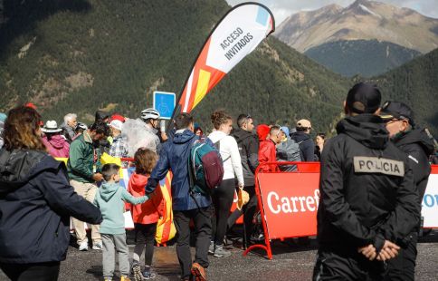 Però l'accident d'Evenepoel pot eclipsar un magnífic final i un recorregut perfecte per territori andorrà. Hi ha hagut banderes per donar i per vendre. Abans de creuar la frontera se n'ha vist una d'estelada al Pla de Sant Tirs, dues de colombianes a l'inici de la N145 just després de la rotonda de la Seu d'Urgell i ja en territori andorrà també n'hi hagut d'espanyoles i una del Barça a la pujada a Arinsal. Espectadors per tot arreu i alguns de disfressats però sense arribar al nivell del Tour. A la pujada a Arinsal n'hi havia un disfressat de personatge de 'La Casa de Papel'.