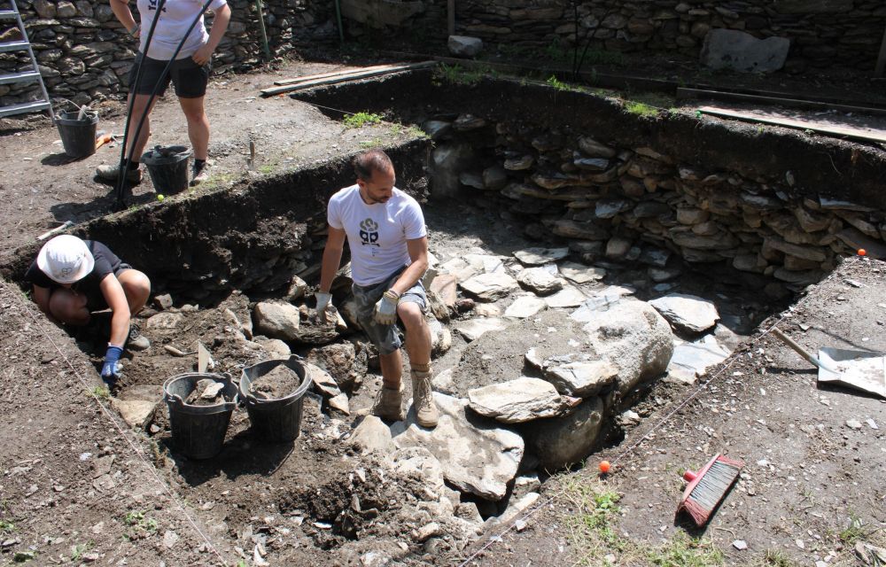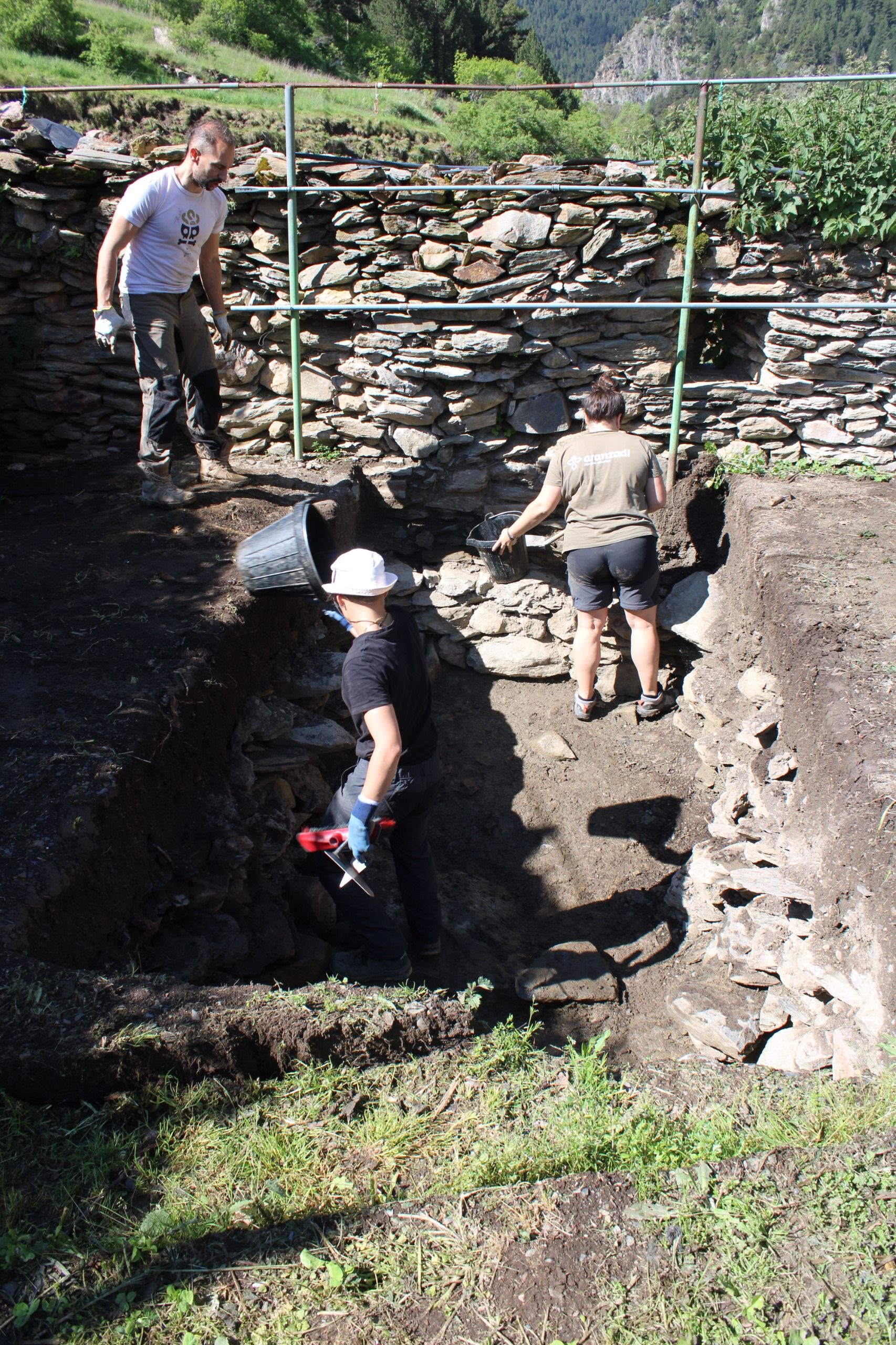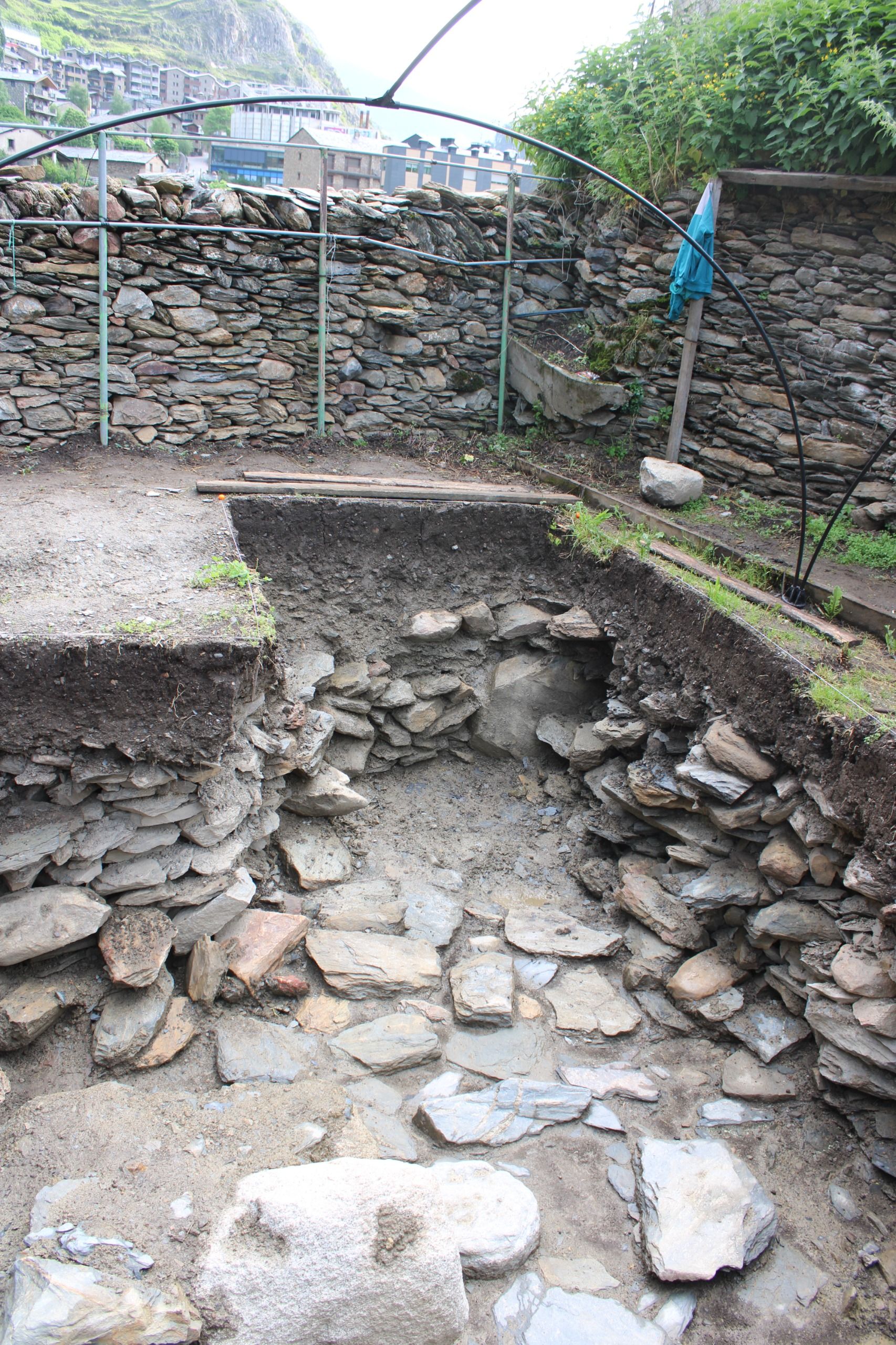 La van abandonar i, aparentment, pel que fos, algú altre, caldrà veure si es pot arribar a saber qui i perquè, la va recuperar i la va fer servir en un altre context, “en aquesta estructura que hem excavat nosaltres ara”. “També ha sortit un altre element singular, que és una gran llosa de pissarra foradada de manera transversal, amb un gran forat. No sabem ben bé què pot ser. Ens sorprèn bastant el forat que té tallat perquè és molt viu i d’aquest forat l’únic que ens ha sabut donar una explicació, en aquest cas, és el Robert Lizarte”. L’actual director de Cultura del comú de Canillo i, sobretot, el responsable de l’arxiu comunal canillenc, Domènec Bascompte, són dos dels impulsors del projecte, de la recerca.