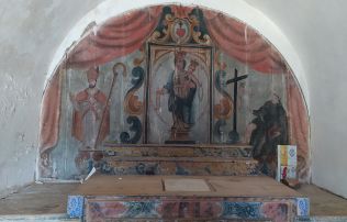 I la petita joia que suposa el retaule sobre taula de fusta de forma semicircular, policromada, dedicat a la Mare de Déu del Rosari. “És un exemple de retaule d’una capella privada i és molt senzill. Es troba a l’extrem oposat dels grans retaules barrocs i és una mostra de la fe de les cases pairals però d’una forma senzilla”, destaca David Mas. En una època amb pocs recursos per garantir una bona collita o per intentar salvar problemes de salut sense massa medicaments, “es recorria a Déu o a un sant en concret”. I Sant Pelegrí és invocat, per exemple, per la cura de les nafres a les cames o fins i tot, per la cura del càncer.
