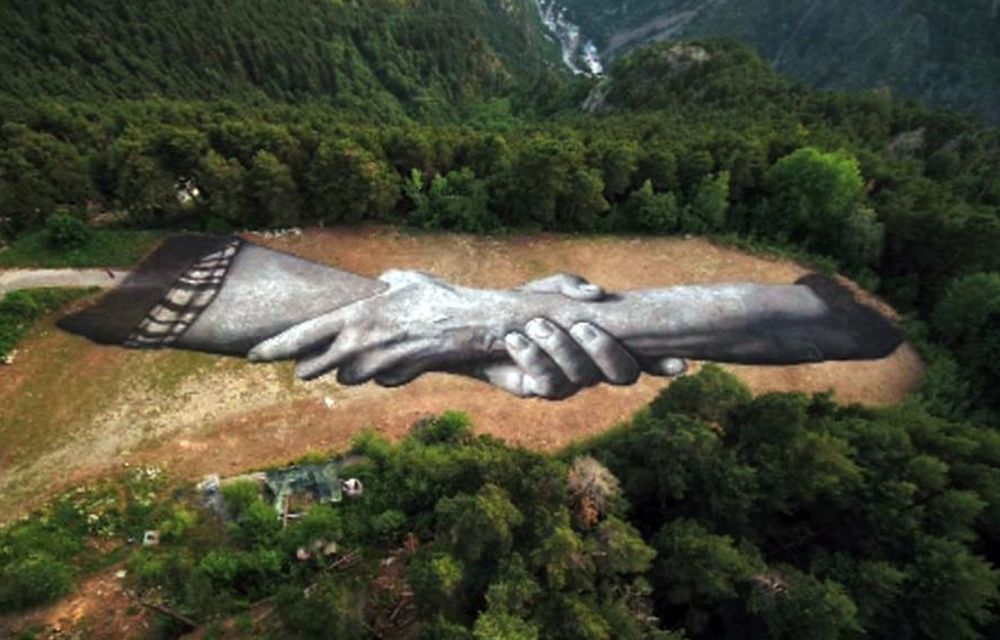 Després de recordar els orígens del ‘land art’ i de repassar sintèticament allò que s’ha anat fent al Principat, Correos explica que “la proposta que va fer el pintor francès Saype per al certamen, titulada ‘Beyondwalls’ ha estat el motiu escollit per il·lustrar el segell”. Es refereix a la tercera edició de la biennal i explica, del projecte de Saype, que eren “dues mans entrellaçades en un mural en blanc i negre que feia cinc-cents metres de llarg per trenta d'ample, realitzat amb pintura ecològica. Recorda que les ‘mans andorranes’ formaven part d’un projecte mundial de l’artista “formant així una cadena humana simbòlica, la més llarga del món, per tal de promoure l'optimisme i la benevolència entre tots els ciutadans del món”.