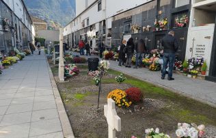 A quarts de dotze del migdia al cementiri del Pessebre d’Escaldes-Engordany el silenci era el protagonista. Un treballador comunal feinejava recollint restes de flors seques i buidant els cubells de brossa que aquests dies s’han omplert més del compte. És Tots Sants i la tradició marca que toca visitar els difunts.