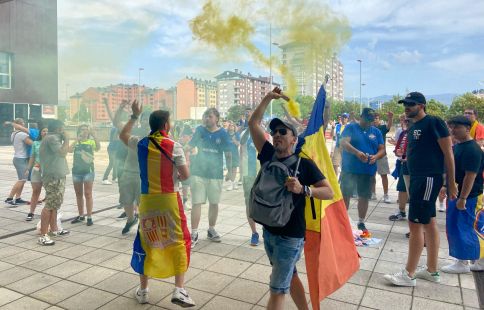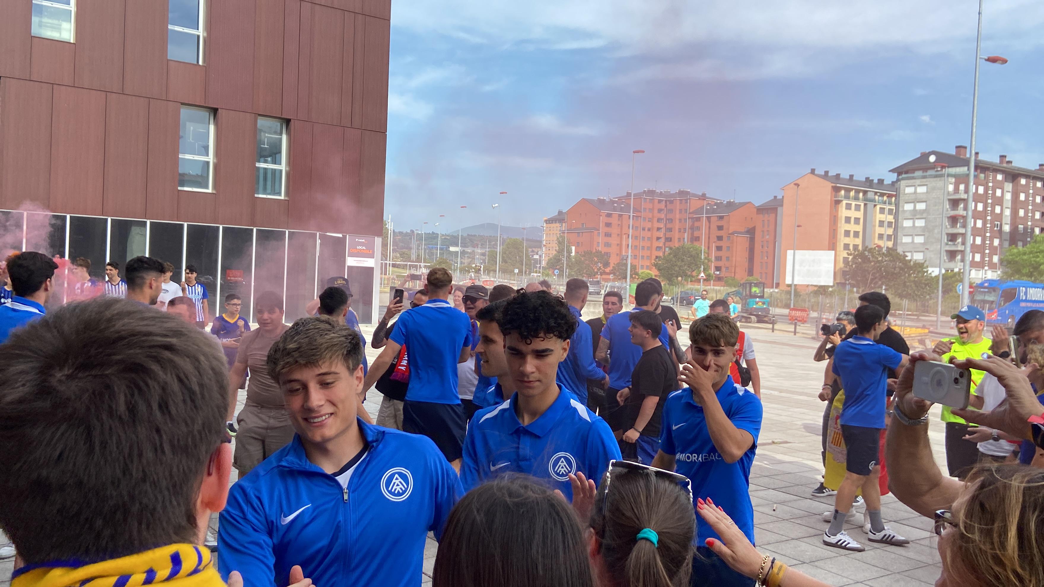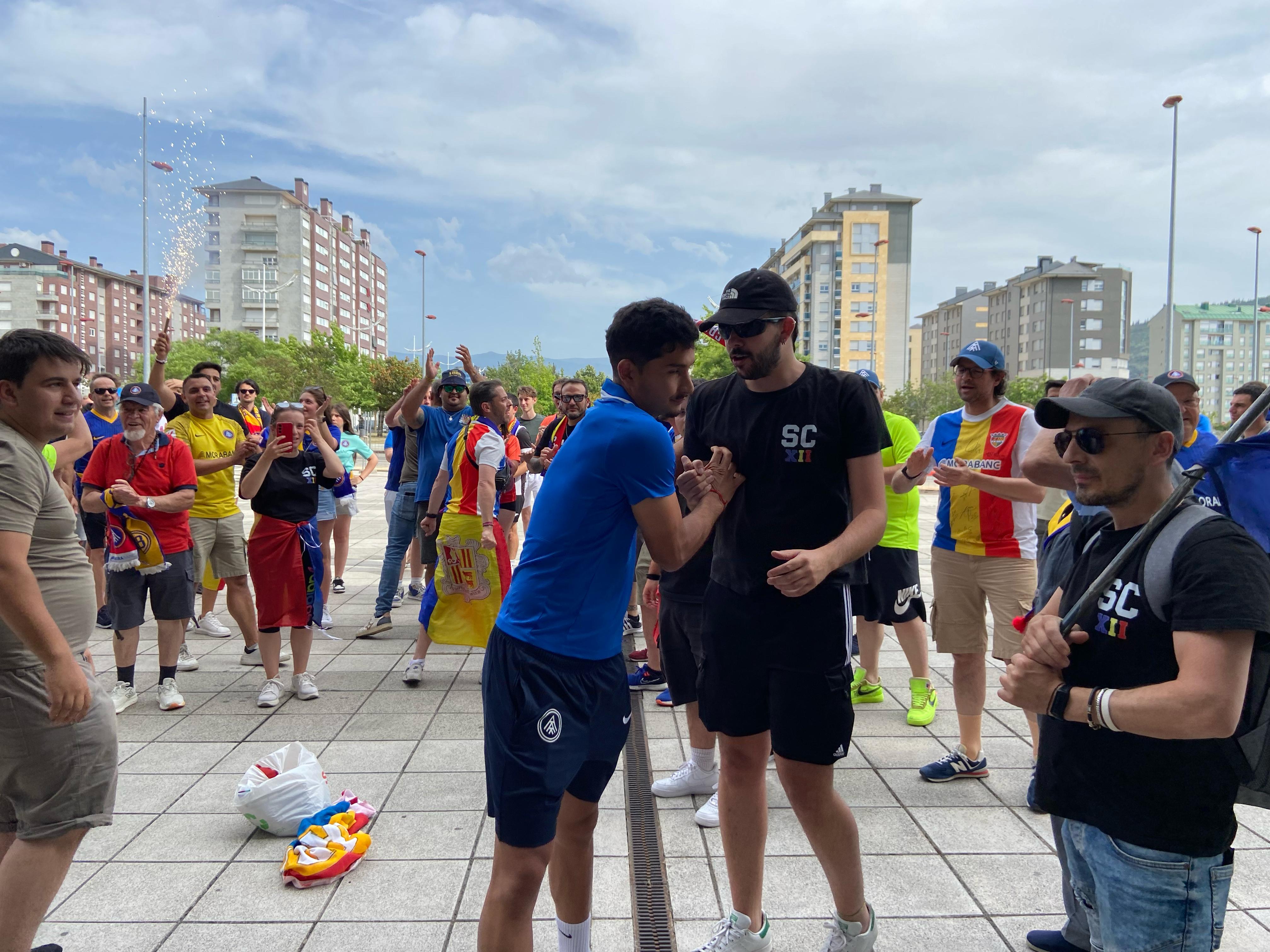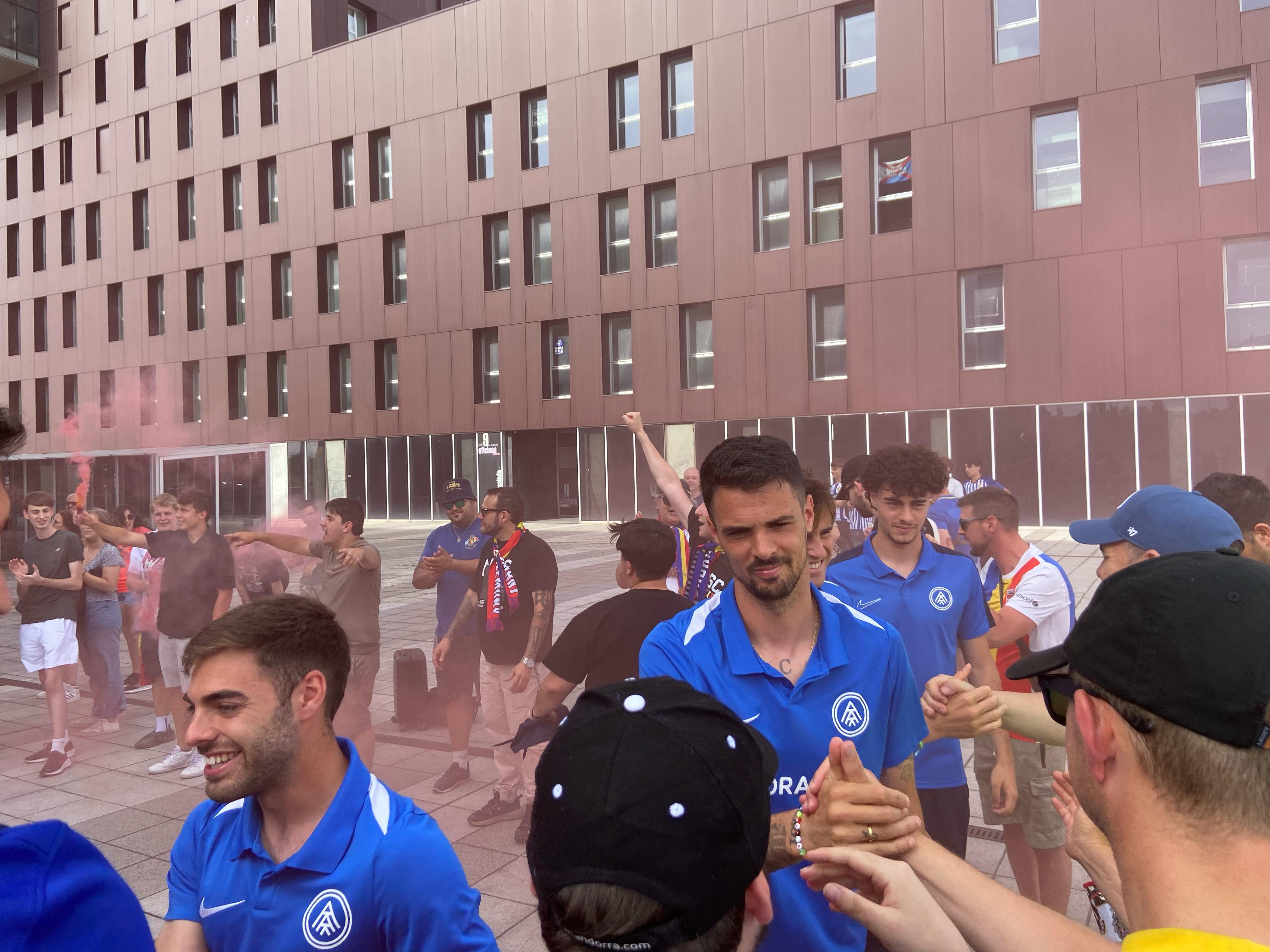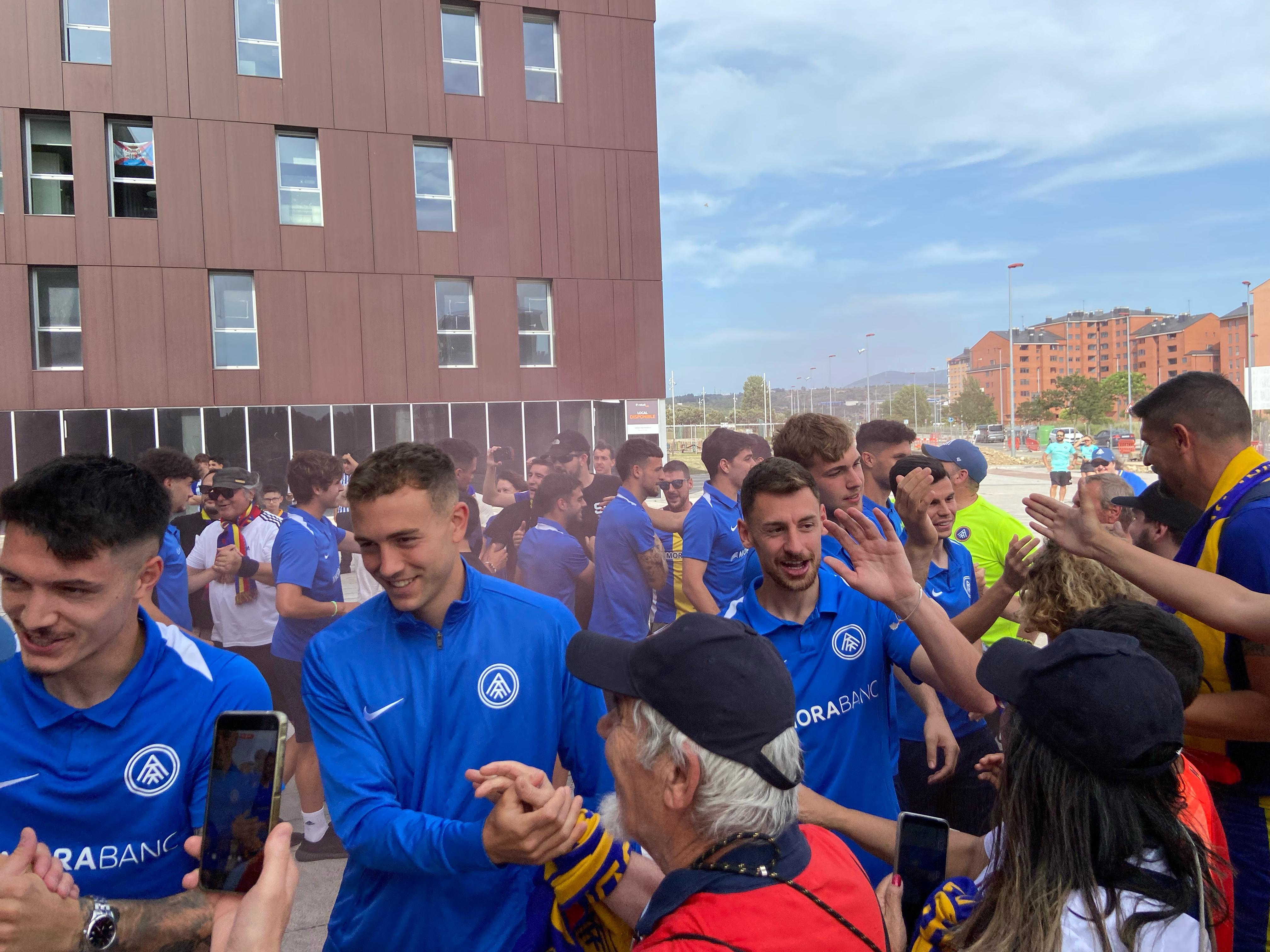 Amb alguna que altra bengala, petards i fum de colors, aquest cop més agradables que no pas els que han escoltat els tricolors durant aquesta matinada, els andorrans han pogut saludar primer al capità Nico Ratti i al tècnic ‘Beto’ Company, mentre que després tota la plantilla ha sortit a saludar-los un per un, agraint-los el seu suport en un desplaçament tan llarg, mentre que l’afició els ha desitjat tota la sort per al duel.