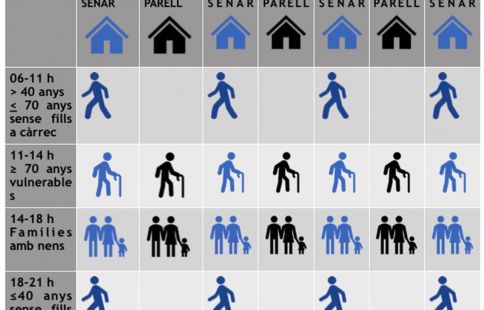 L’esborrany enviat als comuns preveu dividir la població en diferents grups (majors de 40 sense menors a càrrec, majors de 70, majors de 40 amb menors o menors de 40) i a cadascú d’ells se’ls atorga una franja horària. Així, les famílies amb nens podrien sortir entre les dues i les sis de la tarda. També es vol que el dia del mes i el de carrer serveixi per dictaminar quan es pot i quan no es pot sortir.