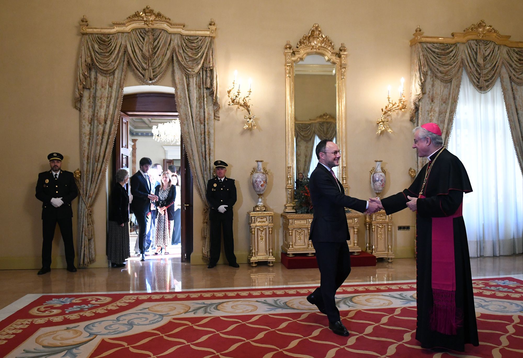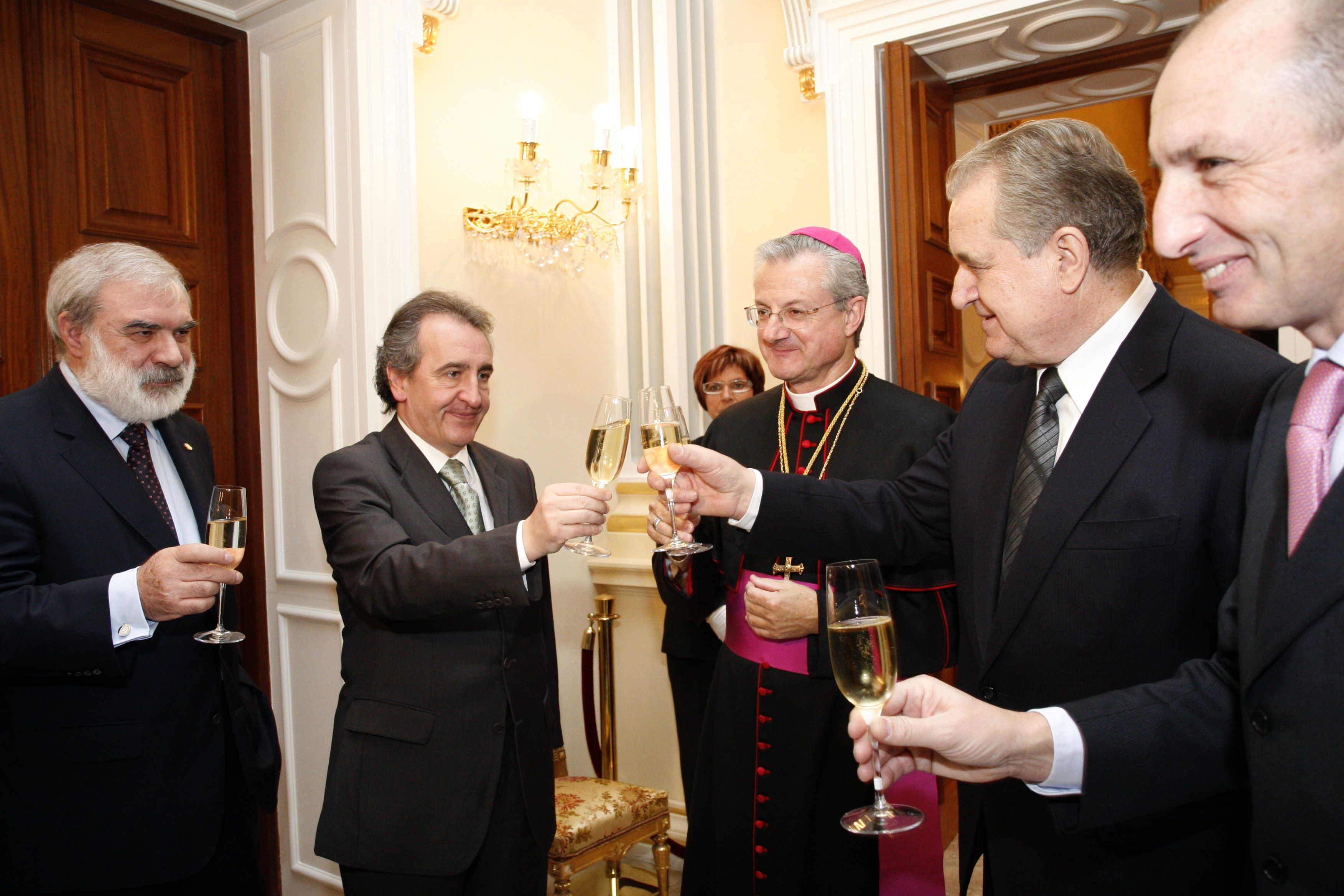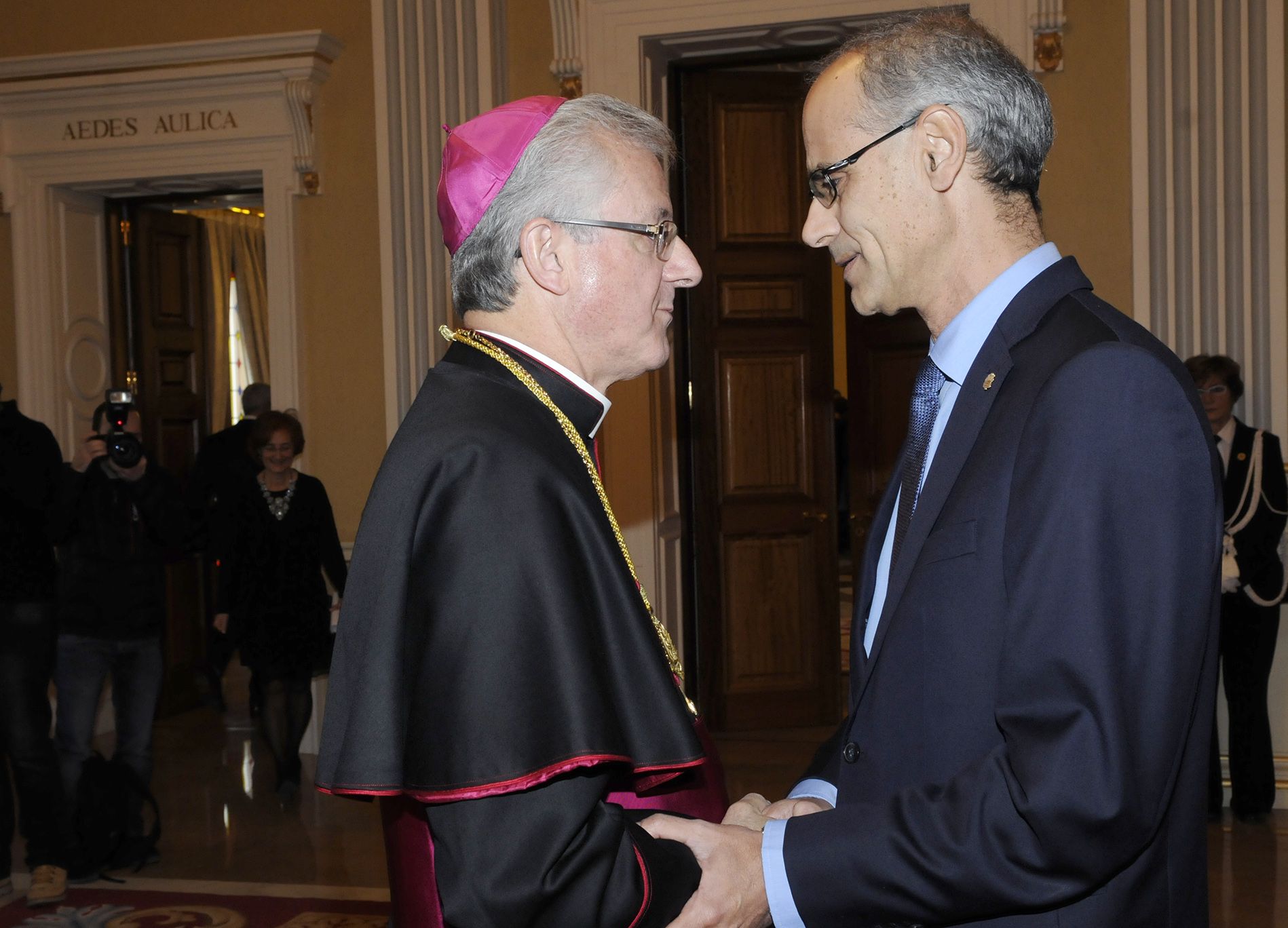 Joan-Enric Vives saludant en una de les recepcions de Nadal el desaparegut Toni Martí.