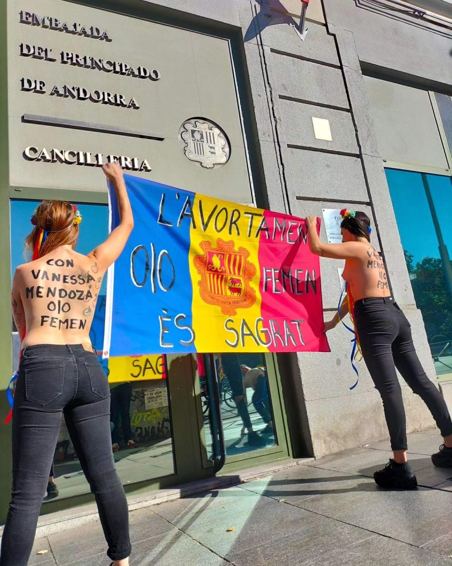 Afers Socials Activistes de Femen es despullen davant l’ambaixada a Madrid en suport a Vanessa Mendoza 01/10/2023
