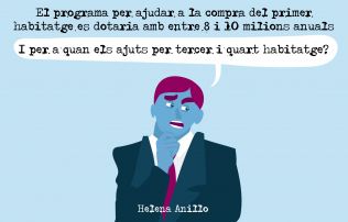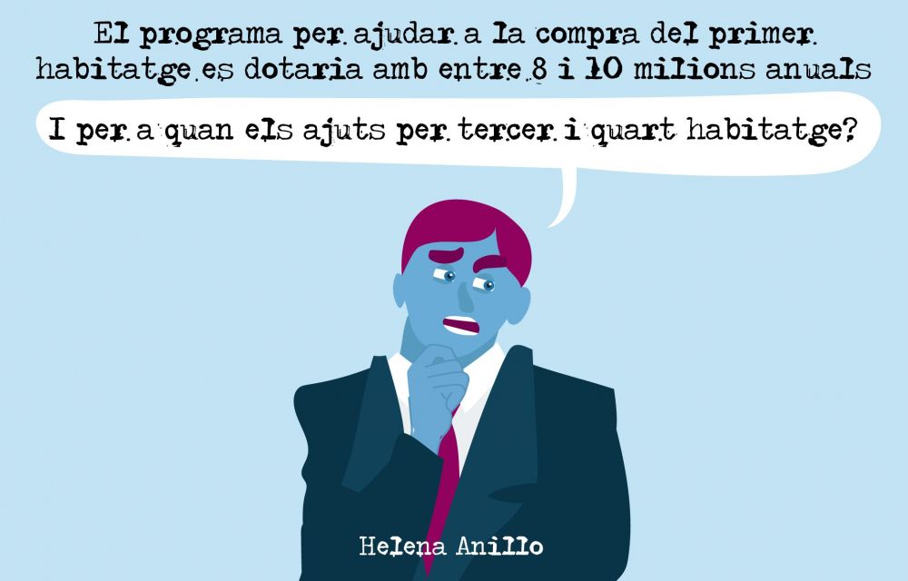La ministra Conxita Marsol va anunciar que el programa per ajudar a la compra del primer habitatge serà “ambiciós” i es dotaria amb entre 8 i 10 milions d’euros, i Helena Anillo es pregunta irònicament quan arribaran els ajuts pel tercer i el quart habitatge.