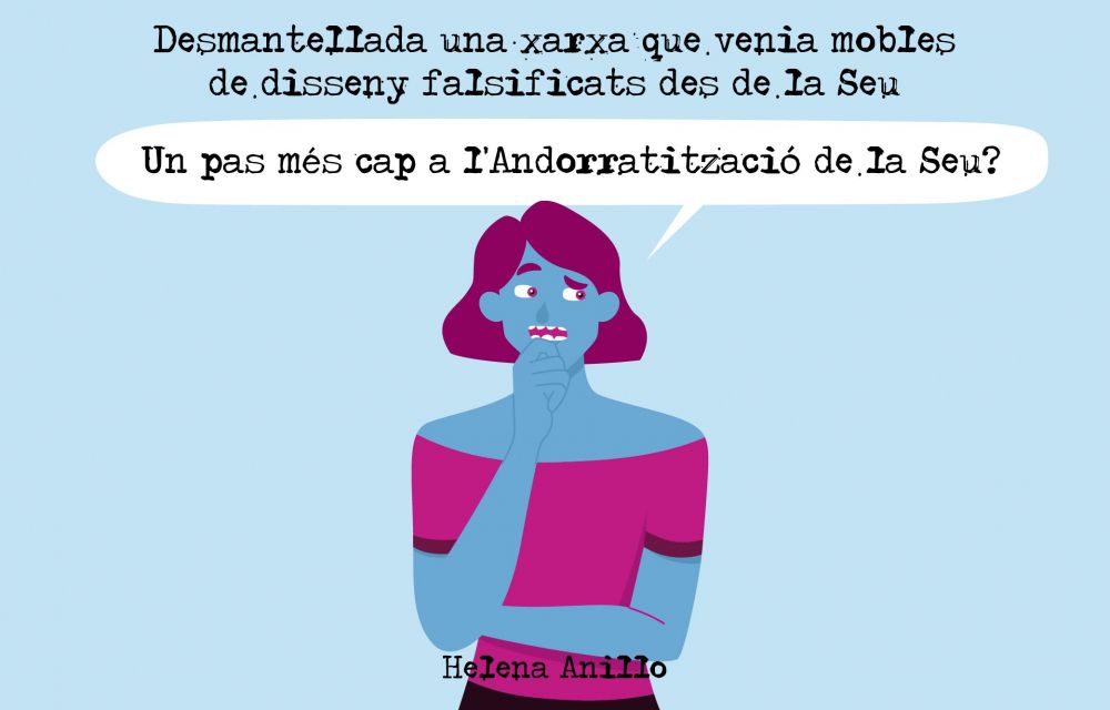 La Policia Nacional ha desmantellat una xarxa que venia mobles de disseny falsificats des de la Seu d’Urgell, intervenint així més de 6.000 peces falses que es distribuïen a tot Europa a través de webs internacionals, i aquesta és la peculiar representació que en fa Helena Anillo.